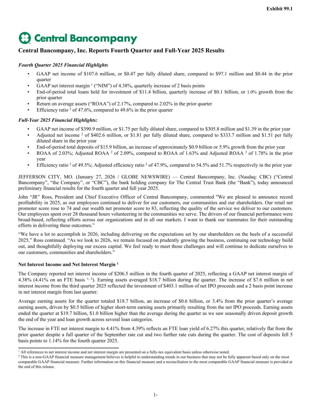 Central Bancompany, Inc. Reports Fourth Quarter and Full-Year 2025 Results Fourth Quarter 2025 Financial Highlights • GAAP net income of $107.6 million, or $0.47 per fully diluted share, compared to $97.1 million and $0.44 in the prior quarter • GAAP net interest margin 1 (“NIM”) of 4.38%, quarterly increase of 2 basis points • End-of-period total loans held for investment of $11.4 billion, quarterly increase of $0.1 billion, or 1.0% growth from the prior quarter • Return on average assets (“ROAA”) of 2.17%, compared to 2.02% in the prior quarter • Efficiency ratio 2 of 47.6%, compared to 49.6% in the prior quarter Full-Year 2025 Financial Highlights: • GAAP net income of $390.9 million, or $1.75 per fully diluted share, compared to $305.8 million and $1.39 in the prior year • Adjusted net income 2 of $402.6 million, or $1.81 per fully diluted share, compared to $333.7 million and $1.51 per fully diluted share in the prior year • End-of-period total deposits of $15.9 billion, an increase of approximately $0.9 billion or 5.9% growth from the prior year • ROAA of 2.03%; Adjusted ROAA 2 of 2.09%, compared to ROAA of 1.63% and Adjusted ROAA 2 of 1.78% in the prior year • Efficiency ratio 2 of 49.5%; Adjusted efficiency ratio 2 of 47.9%, compared to 54.5% and 51.7% respectively in the prior year JEFFERSON CITY, MO. (January 27, 2026 / GLOBE NEWSWIRE) — Central Bancompany, Inc. (Nasdaq: CBC) (“Central Bancompany”, “the Company”, or “CBC”), the bank holding company for The Central Trust Bank (the “Bank”), today announced preliminary financial results for the fourth quarter and full year 2025. John “JR” Ross, President and Chief Executive Officer of Central Bancompany, commented "We are pleased to announce record profitability in 2025, as our employees continued to deliver for our customers, our communities and our shareholders. Our retail net promoter score rose to 74 and our wealth net promoter score to 83, reflecting the quality of the service we deliver to our customers. Our employees spent over 28 thousand hours volunteering in the communities we serve. The drivers of our financial performance were broad-based, reflecting efforts across our organizations and in all our markets. I want to thank our teammates for their outstanding efforts in delivering these outcomes.” “We have a lot to accomplish in 2026, including delivering on the expectations set by our shareholders on the heels of a successful 2025,” Ross continued. “As we look to 2026, we remain focused on prudently growing the business, continuing our technology build out, and thoughtfully deploying our excess capital. We feel ready to meet those challenges and will continue to dedicate ourselves to our customers, communities and shareholders.” Net Interest Income and Net Interest Margin 1 The Company reported net interest income of $206.5 million in the fourth quarter of 2025, reflecting a GAAP net interest margin of 4.38% (4.41% on an FTE basis 1, 2). Earning assets averaged $18.7 billion during the quarter. The increase of $7.6 million in net interest income from the third quarter 2025 reflected the investment of $403.1 million of net IPO proceeds and a 2 basis point increase in net interest margin from last quarter. Average earning assets for the quarter totaled $18.7 billion, an increase of $0.6 billion, or 3.4% from the prior quarter’s average earning assets, driven by $0.5 billion of higher short-term earning assets primarily resulting from the net IPO proceeds. Earning assets ended the quarter at $19.7 billion, $1.0 billion higher than the average during the quarter as we saw seasonally driven deposit growth the end of the year and loan growth across several loan categories. The increase in FTE net interest margin to 4.41% from 4.39% reflects an FTE loan yield of 6.27% this quarter, relatively flat from the prior quarter despite a full quarter of the September rate cut and two further rate cuts during the quarter. The cost of deposits fell 5 basis points to 1.14% for the fourth quarter 2025. Exhibit 99.1 1- 1 All references to net interest income and net interest margin are presented on a fully-tax equivalent basis unless otherwise noted. 2 This is a non-GAAP financial measure management believes is helpful to understanding trends in our business that may not be fully apparent based only on the most comparable GAAP financial measure. Further information on this financial measure and a reconciliation to the most comparable GAAP financial measure is provided at the end of this release.
