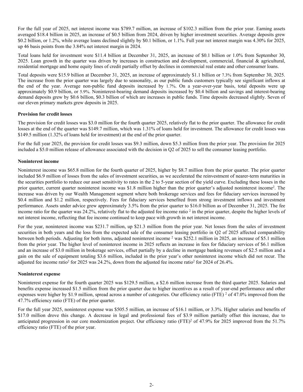 For the full year of 2025, net interest income was $789.7 million, an increase of $102.3 million from the prior year. Earning assets averaged $18.4 billion in 2025, an increase of $0.5 billion from 2024, driven by higher investment securities. Average deposits grew $0.2 billion, or 1.2%, while average loans declined slightly by $0.1 billion, or 1.1%. Full year net interest margin was 4.30% for 2025, up 46 basis points from the 3.84% net interest margin in 2024. Total loans held for investment were $11.4 billion at December 31, 2025, an increase of $0.1 billion or 1.0% from September 30, 2025. Loan growth in the quarter was driven by increases in construction and development, commercial, financial & agricultural, residential mortgage and home equity lines of credit partially offset by declines in commercial real estate and other consumer loans. Total deposits were $15.9 billion at December 31, 2025, an increase of approximately $1.1 billion or 7.3% from September 30, 2025. The increase from the prior quarter was largely due to seasonality, as our public funds customers typically see significant inflows at the end of the year. Average non-public fund deposits increased by 1.7%. On a year-over-year basis, total deposits were up approximately $0.9 billion, or 5.9%. Noninterest-bearing demand deposits increased by $0.4 billion and savings and interest-bearing demand deposits grew by $0.6 billion, $0.3 billion of which are increases in public funds. Time deposits decreased slightly. Seven of our eleven primary markets grew deposits in 2025. Provision for credit losses The provision for credit losses was $3.0 million for the fourth quarter 2025, relatively flat to the prior quarter. The allowance for credit losses at the end of the quarter was $149.7 million, which was 1.31% of loans held for investment. The allowance for credit losses was $149.5 million (1.32% of loans held for investment) at the end of the prior quarter. For the full year 2025, the provision for credit losses was $9.3 million, down $5.3 million from the prior year. The provision for 2025 included a $5.0 million release of allowance associated with the decision in Q2 of 2025 to sell the consumer leasing portfolio. Noninterest income Noninterest income was $65.8 million for the fourth quarter of 2025, higher by $8.7 million from the prior quarter. The prior quarter included $6.9 million of losses from the sales of investment securities, as we accelerated the reinvestment of nearer-term maturities in the securities portfolio to reduce our asset sensitivity to rates in the 2 to 5-year section of the yield curve. Excluding these losses in the prior quarter, current quarter noninterest income was $1.8 million higher than the prior quarter’s adjusted noninterest income2. The increase was driven by our Wealth Management segment where both brokerage services and fees for fiduciary services increased by $0.4 million and $1.2 million, respectively. Fees for fiduciary services benefited from strong investment inflows and investment performance. Assets under advice grew approximately 3.5% from the prior quarter to $16.0 billion as of December 31, 2025. The fee income ratio for the quarter was 24.2%, relatively flat to the adjusted fee income ratio 2 in the prior quarter, despite the higher levels of net interest income, reflecting that fee income continued to keep pace with growth in net interest income. For the year, noninterest income was $231.7 million, up $21.3 million from the prior year. Net losses from the sales of investment securities in both years and the loss from the expected sale of the consumer leasing portfolio in Q2 of 2025 affected comparability between both periods. Adjusting for both items, adjusted noninterest income 2 was $252.1 million in 2025, an increase of $5.1 million from the prior year. The higher level of noninterest income in 2025 reflects an increase in fees for fiduciary services of $6.1 million and an increase of $3.0 million in brokerage services, offset partially by a decline in mortgage banking revenues of $2.5 million and a gain on the sale of equipment totaling $3.6 million, included in the prior year’s other noninterest income which did not recur. The adjusted fee income ratio2 for 2025 was 24.2%, down from the adjusted fee income ratio2 for 2024 of 26.4%. Noninterest expense Noninterest expense for the fourth quarter 2025 was $129.5 million, a $2.6 million increase from the third quarter 2025. Salaries and benefits expense increased $1.5 million from the prior quarter due to higher incentives as a result of year-end performance and other expenses were higher by $1.9 million, spread across a number of categories. Our efficiency ratio (FTE) 2 of 47.0% improved from the 47.7% efficiency ratio (FTE) of the prior quarter. For the full year 2025, noninterest expense was $505.5 million, an increase of $16.1 million, or 3.3%. Higher salaries and benefits of $17.0 million drove this change. A decrease in legal and professional fees of $3.9 million partially offset this increase, due to anticipated progression in our core modernization project. Our efficiency ratio (FTE)2 of 47.9% for 2025 improved from the 51.7% efficiency ratio (FTE) of the prior year. 2-