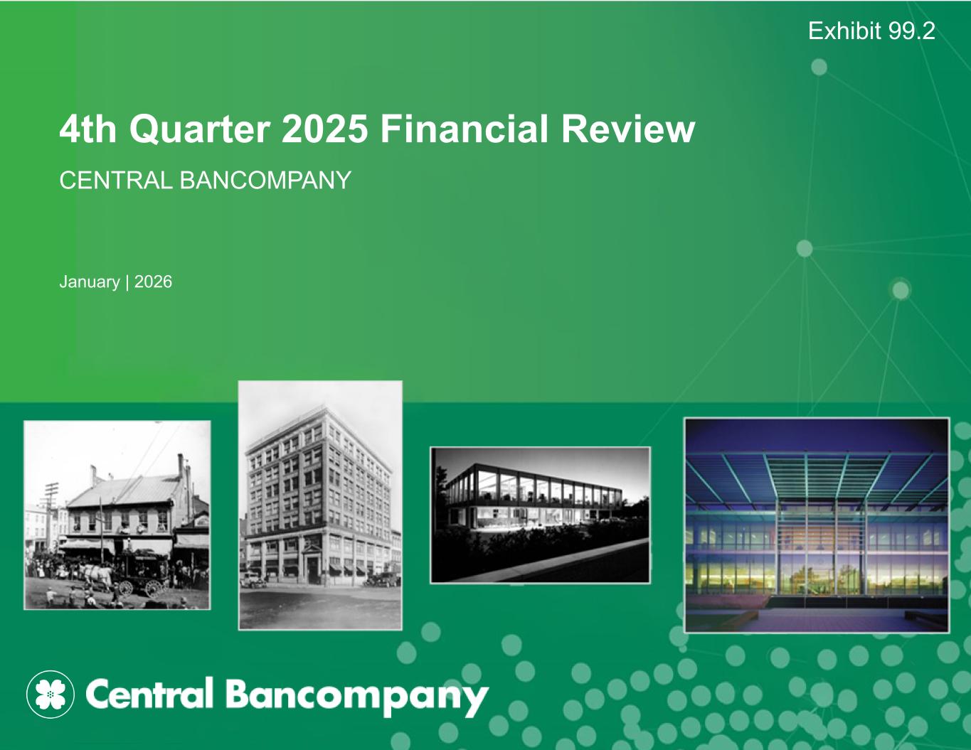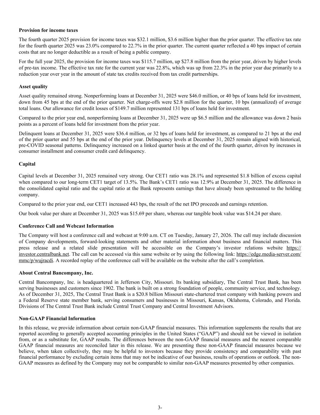 Provision for income taxes The fourth quarter 2025 provision for income taxes was $32.1 million, $3.6 million higher than the prior quarter. The effective tax rate for the fourth quarter 2025 was 23.0% compared to 22.7% in the prior quarter. The current quarter reflected a 40 bps impact of certain costs that are no longer deductible as a result of being a public company. For the full year 2025, the provision for income taxes was $115.7 million, up $27.8 million from the prior year, driven by higher levels of pre-tax income. The effective tax rate for the current year was 22.8%, which was up from 22.3% in the prior year due primarily to a reduction year over year in the amount of state tax credits received from tax credit partnerships. Asset quality Asset quality remained strong. Nonperforming loans at December 31, 2025 were $46.0 million, or 40 bps of loans held for investment, down from 45 bps at the end of the prior quarter. Net charge-offs were $2.8 million for the quarter, 10 bps (annualized) of average total loans. Our allowance for credit losses of $149.7 million represented 131 bps of loans held for investment. Compared to the prior year end, nonperforming loans at December 31, 2025 were up $6.5 million and the allowance was down 2 basis points as a percent of loans held for investment from the prior year. Delinquent loans at December 31, 2025 were $36.4 million, or 32 bps of loans held for investment, as compared to 21 bps at the end of the prior quarter and 55 bps at the end of the prior year. Delinquency levels at December 31, 2025 remain aligned with historical, pre-COVID seasonal patterns. Delinquency increased on a linked quarter basis at the end of the fourth quarter, driven by increases in consumer installment and consumer credit card delinquency. Capital Capital levels at December 31, 2025 remained very strong. Our CET1 ratio was 28.1% and represented $1.8 billion of excess capital when compared to our long-term CET1 target of 13.5%. The Bank’s CET1 ratio was 12.9% at December 31, 2025. The difference in the consolidated capital ratio and the capital ratio at the Bank represents earnings that have already been upstreamed to the holding company. Compared to the prior year end, our CET1 increased 443 bps, the result of the net IPO proceeds and earnings retention. Our book value per share at December 31, 2025 was $15.69 per share, whereas our tangible book value was $14.24 per share. Conference Call and Webcast Information The Company will host a conference call and webcast at 9:00 a.m. CT on Tuesday, January 27, 2026. The call may include discussion of Company developments, forward-looking statements and other material information about business and financial matters. This press release and a related slide presentation will be accessible on the Company’s investor relations website https:// investor.centralbank.net. The call can be accessed via this same website or by using the following link: https://edge.media-server.com/ mmc/p/wujracdi. A recorded replay of the conference call will be available on the website after the call’s completion. About Central Bancompany, Inc. Central Bancompany, Inc. is headquartered in Jefferson City, Missouri. Its banking subsidiary, The Central Trust Bank, has been serving businesses and customers since 1902. The bank is built on a strong foundation of people, community service, and technology. As of December 31, 2025, The Central Trust Bank is a $20.8 billion Missouri state-chartered trust company with banking powers and a Federal Reserve state member bank, serving consumers and businesses in Missouri, Kansas, Oklahoma, Colorado, and Florida. Divisions of The Central Trust Bank include Central Trust Company and Central Investment Advisors. Non-GAAP Financial Information In this release, we provide information about certain non-GAAP financial measures. This information supplements the results that are reported according to generally accepted accounting principles in the United States (“GAAP”) and should not be viewed in isolation from, or as a substitute for, GAAP results. The differences between the non-GAAP financial measures and the nearest comparable GAAP financial measures are reconciled later in this release. We are presenting these non-GAAP financial measures because we believe, when taken collectively, they may be helpful to investors because they provide consistency and comparability with past financial performance by excluding certain items that may not be indicative of our business, results of operations or outlook. The non- GAAP measures as defined by the Company may not be comparable to similar non-GAAP measures presented by other companies. 3-