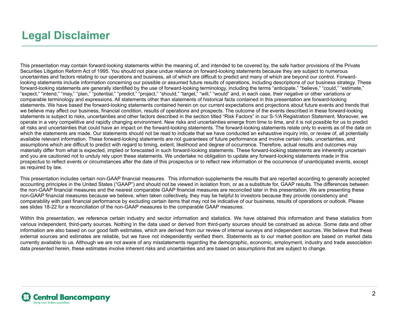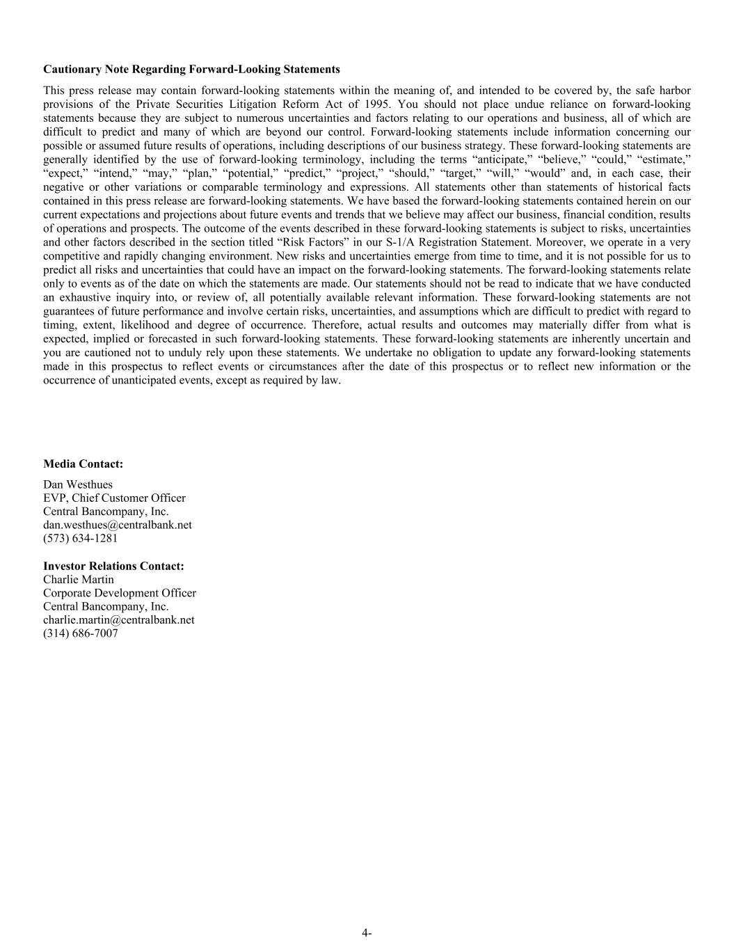 Cautionary Note Regarding Forward-Looking Statements This press release may contain forward-looking statements within the meaning of, and intended to be covered by, the safe harbor provisions of the Private Securities Litigation Reform Act of 1995. You should not place undue reliance on forward-looking statements because they are subject to numerous uncertainties and factors relating to our operations and business, all of which are difficult to predict and many of which are beyond our control. Forward-looking statements include information concerning our possible or assumed future results of operations, including descriptions of our business strategy. These forward-looking statements are generally identified by the use of forward-looking terminology, including the terms “anticipate,” “believe,” “could,” “estimate,” “expect,” “intend,” “may,” “plan,” “potential,” “predict,” “project,” “should,” “target,” “will,” “would” and, in each case, their negative or other variations or comparable terminology and expressions. All statements other than statements of historical facts contained in this press release are forward-looking statements. We have based the forward-looking statements contained herein on our current expectations and projections about future events and trends that we believe may affect our business, financial condition, results of operations and prospects. The outcome of the events described in these forward-looking statements is subject to risks, uncertainties and other factors described in the section titled “Risk Factors” in our S-1/A Registration Statement. Moreover, we operate in a very competitive and rapidly changing environment. New risks and uncertainties emerge from time to time, and it is not possible for us to predict all risks and uncertainties that could have an impact on the forward-looking statements. The forward-looking statements relate only to events as of the date on which the statements are made. Our statements should not be read to indicate that we have conducted an exhaustive inquiry into, or review of, all potentially available relevant information. These forward-looking statements are not guarantees of future performance and involve certain risks, uncertainties, and assumptions which are difficult to predict with regard to timing, extent, likelihood and degree of occurrence. Therefore, actual results and outcomes may materially differ from what is expected, implied or forecasted in such forward-looking statements. These forward-looking statements are inherently uncertain and you are cautioned not to unduly rely upon these statements. We undertake no obligation to update any forward-looking statements made in this prospectus to reflect events or circumstances after the date of this prospectus or to reflect new information or the occurrence of unanticipated events, except as required by law. Media Contact: Dan Westhues EVP, Chief Customer Officer Central Bancompany, Inc. dan.westhues@centralbank.net (573) 634-1281 Investor Relations Contact: Charlie Martin Corporate Development Officer Central Bancompany, Inc. charlie.martin@centralbank.net (314) 686-7007 4-