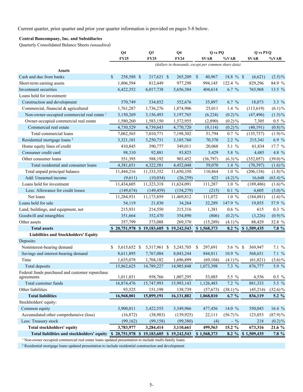 Current quarter, prior quarter and prior year quarter information is provided on pages 5-8 below. Central Bancompany, Inc. and Subsidiaries Quarterly Consolidated Balance Sheets (unaudited) Q4 Q3 Q4 Q vs PQ Q vs PYQ FY25 FY25 FY24 $VAR %VAR $VAR %VAR (dollars in thousands, except per common share data) Assets Cash and due from banks $ 258,588 $ 217,621 $ 265,209 $ 40,967 18.8 % $ (6,621) (2.5) % Short-term earning assets 1,806,594 812,449 977,298 994,145 122.4 % 829,296 84.9 % Investment securities 6,422,352 6,017,738 5,656,384 404,614 6.7 % 765,968 13.5 % Loans held for investment: Construction and development 570,749 534,852 552,676 35,897 6.7 % 18,073 3.3 % Commercial, financial & agricultural 1,761,287 1,736,276 1,874,906 25,011 1.4 % (113,619) (6.1) % Non-owner-occupied commercial real estate 1 3,150,269 3,156,493 3,197,765 (6,224) (0.2) % (47,496) (1.5) % Owner-occupied commercial real estate 1,580,260 1,583,150 1,572,955 (2,890) (0.2) % 7,305 0.5 % Commercial real estate 4,730,529 4,739,643 4,770,720 (9,114) (0.2) % (40,191) (0.8) % Total commercial loans 7,062,565 7,010,771 7,198,302 51,794 0.7 % (135,737) (1.9) % Residential mortgage loans 2 3,321,101 3,250,731 3,105,760 70,370 2.2 % 215,341 6.9 % Home equity lines of credit 410,845 390,777 349,011 20,068 5.1 % 61,834 17.7 % Consumer credit card 98,310 92,881 93,825 5,429 5.8 % 4,485 4.8 % Other consumer loans 551,395 588,192 903,452 (36,797) (6.3) % (352,057) (39.0) % Total residential and consumer loans 4,381,651 4,322,581 4,452,048 59,070 1.4 % (70,397) (1.6) % Total unpaid principal balance 11,444,216 11,333,352 11,650,350 110,864 1.0 % (206,134) (1.8) % Add: Unearned income (9,611) (10,034) (26,259) 423 (4.2) % 16,648 (63.4) % Loans held for investment 11,434,605 11,323,318 11,624,091 111,287 1.0 % (189,486) (1.6) % Less: Allowance for credit losses (149,674) (149,459) (154,279) (215) 0.1 % 4,605 (3.0) % Net loans 11,284,931 11,173,859 11,469,812 111,072 1.0 % (184,881) (1.6) % Loans held for sale 54,119 21,830 34,264 32,289 147.9 % 19,855 57.9 % Land, buildings, and equipment, net 215,931 214,550 215,316 1,381 0.6 % 615 0.3 % Goodwill and intangibles 351,664 352,470 354,890 (806) (0.2) % (3,226) (0.9) % Other assets 357,799 373,088 269,370 (15,289) (4.1) % 88,429 32.8 % Total assets $ 20,751,978 $ 19,183,605 $ 19,242,543 $ 1,568,373 8.2 % $ 1,509,435 7.8 % Liabilities and Stockholders' Equity Deposits: Noninterest-bearing demand $ 5,615,652 $ 5,317,961 $ 5,245,705 $ 297,691 5.6 % $ 369,947 7.1 % Savings and interest-bearing demand 8,611,895 7,767,084 8,043,244 844,811 10.9 % 568,651 7.1 % Time 1,635,078 1,704,182 1,696,899 (69,104) (4.1) % (61,821) (3.6) % Total deposits 15,862,625 14,789,227 14,985,848 1,073,398 7.3 % 876,777 5.9 % Federal funds purchased and customer repurchase agreements 1,011,851 958,766 1,007,295 53,085 5.5 % 4,556 0.5 % Total customer funds 16,874,476 15,747,993 15,993,143 1,126,483 7.2 % 881,333 5.5 % Other liabilities 93,525 151,198 138,739 (57,673) (38.1) % (45,214) (32.6) % Total liabilities 16,968,001 15,899,191 16,131,882 1,068,810 6.7 % 836,119 5.2 % Stockholders' equity: Common equity 3,900,011 3,422,555 3,349,966 477,456 14.0 % 550,045 16.4 % Accumulated other comprehensive (loss) (16,872) (38,983) (139,925) 22,111 (56.7) % 123,053 (87.9) % Less: Treasury stock (99,162) (99,158) (99,380) (4) - % 218 (0.2) % Total stockholders' equity 3,783,977 3,284,414 3,110,661 499,563 15.2 % 673,316 21.6 % Total liabilities and stockholders' equity $ 20,751,978 $ 19,183,605 $ 19,242,543 $ 1,568,373 8.2 % $ 1,509,435 7.8 % 1 Non-owner occupied commercial real estate loans updated presentation to include multi-family loans 2 Residential mortgage loans updated presentation to include residential construction and development 5-