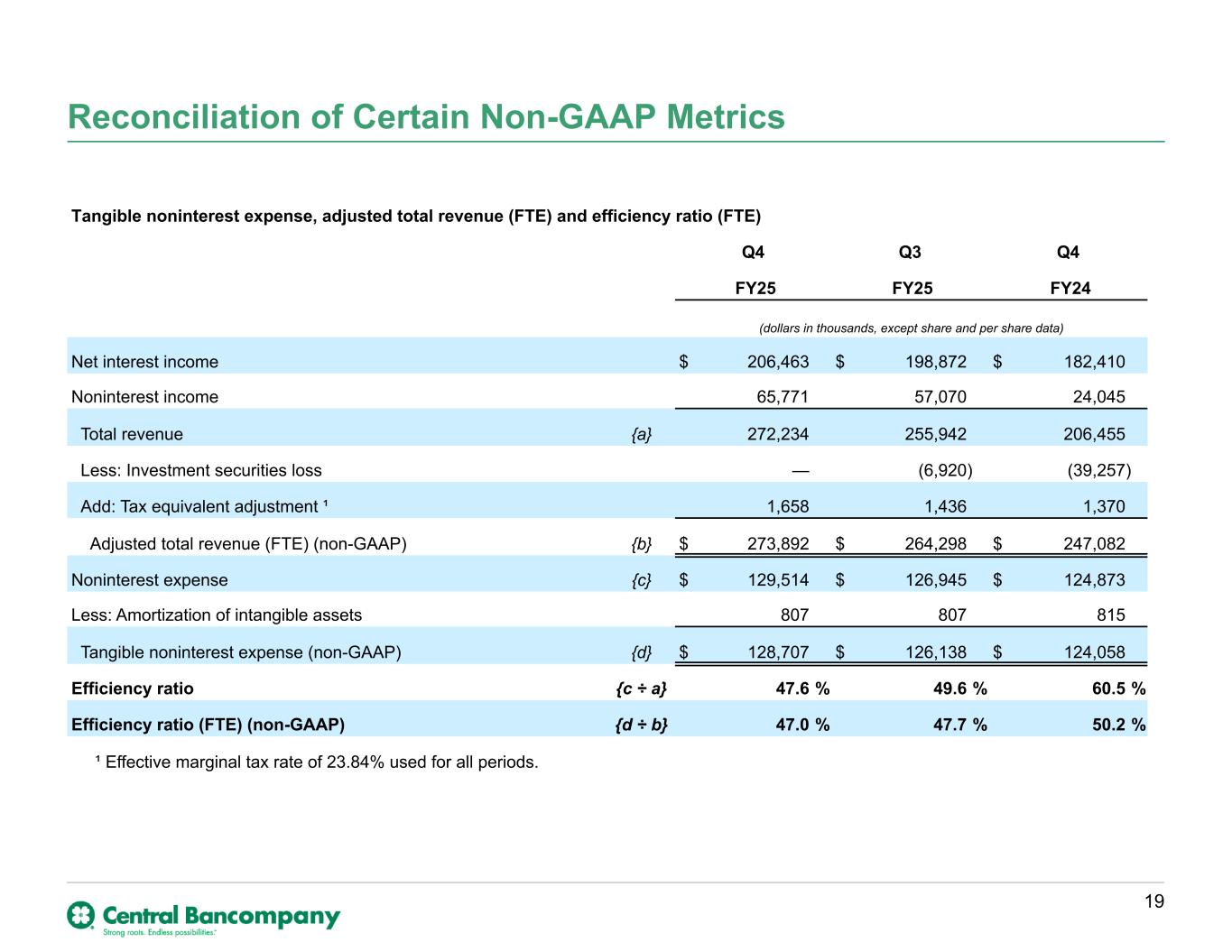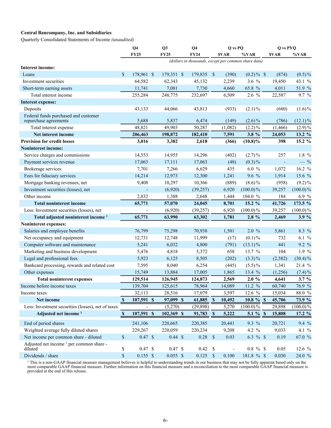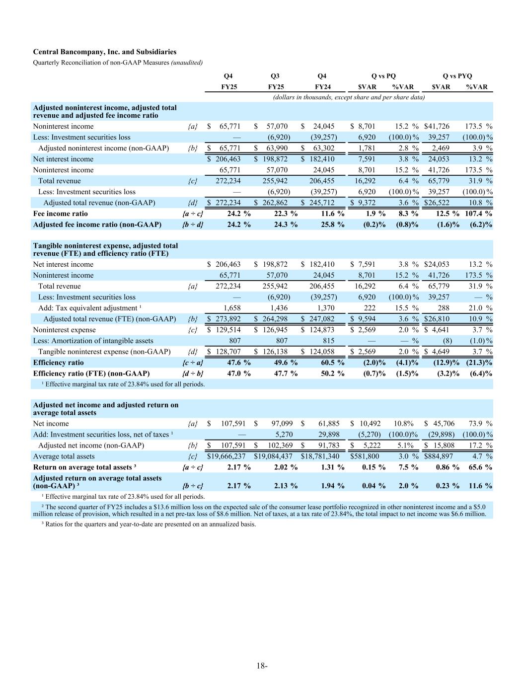 Adjusted noninterest income, adjusted total revenue and adjusted fee income ratio Noninterest income {a} $ 65,771 $ 57,070 $ 24,045 $ 8,701 15.2 % $ 41,726 173.5 % Less: Investment securities loss — (6,920) (39,257) 6,920 (100.0) % 39,257 (100.0) % Adjusted noninterest income (non-GAAP) {b} $ 65,771 $ 63,990 $ 63,302 1,781 2.8 % 2,469 3.9 % Net interest income $ 206,463 $ 198,872 $ 182,410 7,591 3.8 % 24,053 13.2 % Noninterest income 65,771 57,070 24,045 8,701 15.2 % 41,726 173.5 % Total revenue {c} 272,234 255,942 206,455 16,292 6.4 % 65,779 31.9 % Less: Investment securities loss — (6,920) (39,257) 6,920 (100.0) % 39,257 (100.0) % Adjusted total revenue (non-GAAP) {d} $ 272,234 $ 262,862 $ 245,712 $ 9,372 3.6 % $ 26,522 10.8 % Fee income ratio {a ÷ c} 24.2 % 22.3 % 11.6 % 1.9 % 8.3 % 12.5 % 107.4 % Adjusted fee income ratio (non-GAAP) {b ÷ d} 24.2 % 24.3 % 25.8 % (0.2) % (0.8) % (1.6) % (6.2) % Tangible noninterest expense, adjusted total revenue (FTE) and efficiency ratio (FTE) Net interest income $ 206,463 $ 198,872 $ 182,410 $ 7,591 3.8 % $ 24,053 13.2 % Noninterest income 65,771 57,070 24,045 8,701 15.2 % 41,726 173.5 % Total revenue {a} 272,234 255,942 206,455 16,292 6.4 % 65,779 31.9 % Less: Investment securities loss — (6,920) (39,257) 6,920 (100.0) % 39,257 — % Add: Tax equivalent adjustment ¹ 1,658 1,436 1,370 222 15.5 % 288 21.0 % Adjusted total revenue (FTE) (non-GAAP) {b} $ 273,892 $ 264,298 $ 247,082 $ 9,594 3.6 % $ 26,810 10.9 % Noninterest expense {c} $ 129,514 $ 126,945 $ 124,873 $ 2,569 2.0 % $ 4,641 3.7 % Less: Amortization of intangible assets 807 807 815 — — % (8) (1.0) % Tangible noninterest expense (non-GAAP) {d} $ 128,707 $ 126,138 $ 124,058 $ 2,569 2.0 % $ 4,649 3.7 % Efficiency ratio {c ÷ a} 47.6 % 49.6 % 60.5 % (2.0) % (4.1) % (12.9) % (21.3) % Efficiency ratio (FTE) (non-GAAP) {d ÷ b} 47.0 % 47.7 % 50.2 % (0.7) % (1.5) % (3.2) % (6.4) % ¹ Effective marginal tax rate of 23.84% used for all periods. Adjusted net income and adjusted return on average total assets Net income {a} $ 107,591 $ 97,099 $ 61,885 $ 10,492 10.8 % $ 45,706 73.9 % Add: Investment securities loss, net of taxes ¹ — 5,270 29,898 (5,270) (100.0) % (29,898) (100.0) % Adjusted net income (non-GAAP) {b} $ 107,591 $ 102,369 $ 91,783 $ 5,222 5.1 % $ 15,808 17.2 % Average total assets {c} $ 19,666,237 $ 19,084,437 $ 18,781,340 $ 581,800 3.0 % $ 884,897 4.7 % Return on average total assets ³ {a ÷ c} 2.17 % 2.02 % 1.31 % 0.15 % 7.5 % 0.86 % 65.6 % Adjusted return on average total assets (non-GAAP) ³ {b ÷ c} 2.17 % 2.13 % 1.94 % 0.04 % 2.0 % 0.23 % 11.6 % ¹ Effective marginal tax rate of 23.84% used for all periods. ² The second quarter of FY25 includes a $13.6 million loss on the expected sale of the consumer lease portfolio recognized in other noninterest income and a $5.0 million release of provision, which resulted in a net pre-tax loss of $8.6 million. Net of taxes, at a tax rate of 23.84%, the total impact to net income was $6.6 million. ³ Ratios for the quarters and year-to-date are presented on an annualized basis. Central Bancompany, Inc. and Subsidiaries Quarterly Reconciliation of non-GAAP Measures (unaudited) Q4 Q3 Q4 Q vs PQ Q vs PYQ FY25 FY25 FY24 $VAR %VAR $VAR %VAR (dollars in thousands, except share and per share data) 18-