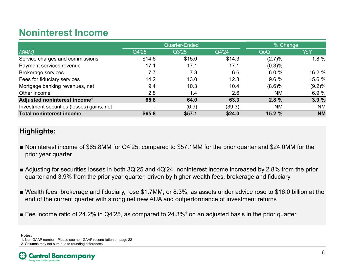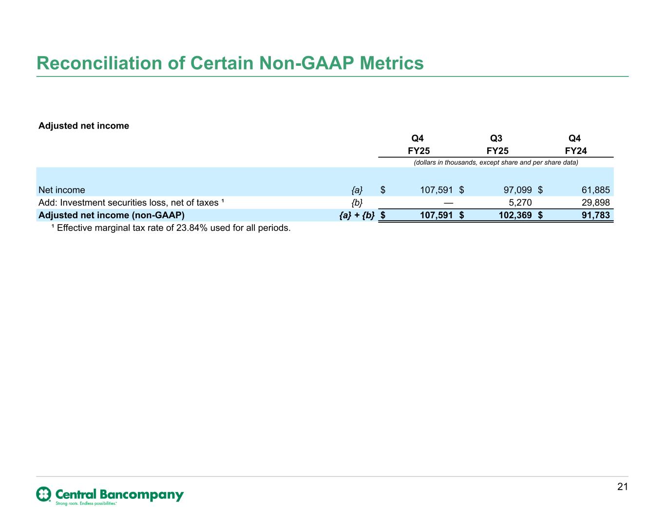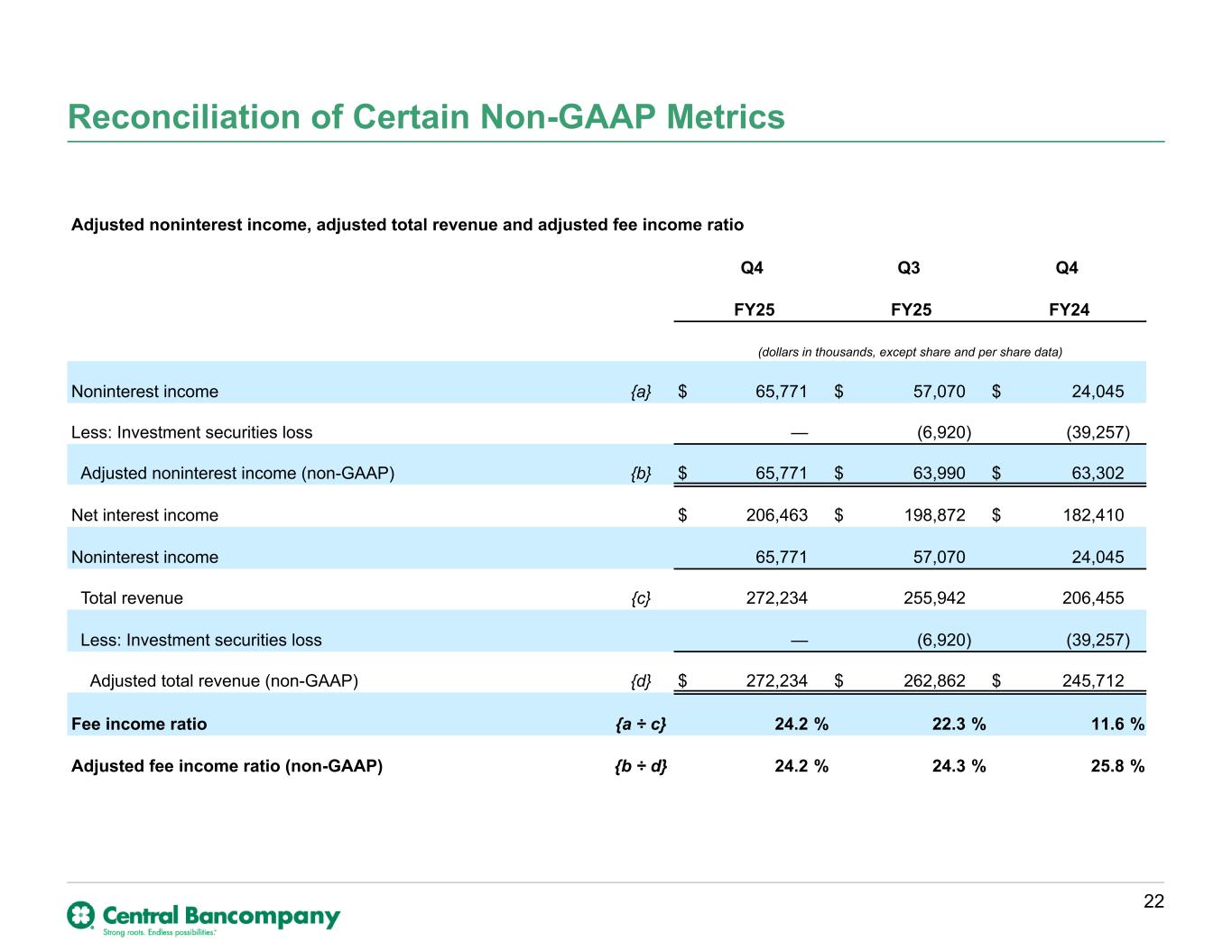Adjusted noninterest income, adjusted total revenue and adjusted fee income ratio Noninterest income {a} $ 65,771 $ 57,070 $ 24,045 $ 8,701 15.2 % $ 41,726 173.5 % Less: Investment securities loss — (6,920) (39,257) 6,920 (100.0) % 39,257 (100.0) % Adjusted noninterest income (non-GAAP) {b} $ 65,771 $ 63,990 $ 63,302 1,781 2.8 % 2,469 3.9 % Net interest income $ 206,463 $ 198,872 $ 182,410 7,591 3.8 % 24,053 13.2 % Noninterest income 65,771 57,070 24,045 8,701 15.2 % 41,726 173.5 % Total revenue {c} 272,234 255,942 206,455 16,292 6.4 % 65,779 31.9 % Less: Investment securities loss — (6,920) (39,257) 6,920 (100.0) % 39,257 (100.0) % Adjusted total revenue (non-GAAP) {d} $ 272,234 $ 262,862 $ 245,712 $ 9,372 3.6 % $ 26,522 10.8 % Fee income ratio {a ÷ c} 24.2 % 22.3 % 11.6 % 1.9 % 8.3 % 12.5 % 107.4 % Adjusted fee income ratio (non-GAAP) {b ÷ d} 24.2 % 24.3 % 25.8 % (0.2) % (0.8) % (1.6) % (6.2) % Tangible noninterest expense, adjusted total revenue (FTE) and efficiency ratio (FTE) Net interest income $ 206,463 $ 198,872 $ 182,410 $ 7,591 3.8 % $ 24,053 13.2 % Noninterest income 65,771 57,070 24,045 8,701 15.2 % 41,726 173.5 % Total revenue {a} 272,234 255,942 206,455 16,292 6.4 % 65,779 31.9 % Less: Investment securities loss — (6,920) (39,257) 6,920 (100.0) % 39,257 — % Add: Tax equivalent adjustment ¹ 1,658 1,436 1,370 222 15.5 % 288 21.0 % Adjusted total revenue (FTE) (non-GAAP) {b} $ 273,892 $ 264,298 $ 247,082 $ 9,594 3.6 % $ 26,810 10.9 % Noninterest expense {c} $ 129,514 $ 126,945 $ 124,873 $ 2,569 2.0 % $ 4,641 3.7 % Less: Amortization of intangible assets 807 807 815 — — % (8) (1.0) % Tangible noninterest expense (non-GAAP) {d} $ 128,707 $ 126,138 $ 124,058 $ 2,569 2.0 % $ 4,649 3.7 % Efficiency ratio {c ÷ a} 47.6 % 49.6 % 60.5 % (2.0) % (4.1) % (12.9) % (21.3) % Efficiency ratio (FTE) (non-GAAP) {d ÷ b} 47.0 % 47.7 % 50.2 % (0.7) % (1.5) % (3.2) % (6.4) % ¹ Effective marginal tax rate of 23.84% used for all periods. Adjusted net income and adjusted return on average total assets Net income {a} $ 107,591 $ 97,099 $ 61,885 $ 10,492 10.8 % $ 45,706 73.9 % Add: Investment securities loss, net of taxes ¹ — 5,270 29,898 (5,270) (100.0) % (29,898) (100.0) % Adjusted net income (non-GAAP) {b} $ 107,591 $ 102,369 $ 91,783 $ 5,222 5.1 % $ 15,808 17.2 % Average total assets {c} $ 19,666,237 $ 19,084,437 $ 18,781,340 $ 581,800 3.0 % $ 884,897 4.7 % Return on average total assets ³ {a ÷ c} 2.17 % 2.02 % 1.31 % 0.15 % 7.5 % 0.86 % 65.6 % Adjusted return on average total assets (non-GAAP) ³ {b ÷ c} 2.17 % 2.13 % 1.94 % 0.04 % 2.0 % 0.23 % 11.6 % ¹ Effective marginal tax rate of 23.84% used for all periods. ² The second quarter of FY25 includes a $13.6 million loss on the expected sale of the consumer lease portfolio recognized in other noninterest income and a $5.0 million release of provision, which resulted in a net pre-tax loss of $8.6 million. Net of taxes, at a tax rate of 23.84%, the total impact to net income was $6.6 million. ³ Ratios for the quarters and year-to-date are presented on an annualized basis. Central Bancompany, Inc. and Subsidiaries Quarterly Reconciliation of non-GAAP Measures (unaudited) Q4 Q3 Q4 Q vs PQ Q vs PYQ FY25 FY25 FY24 $VAR %VAR $VAR %VAR (dollars in thousands, except share and per share data) 18-