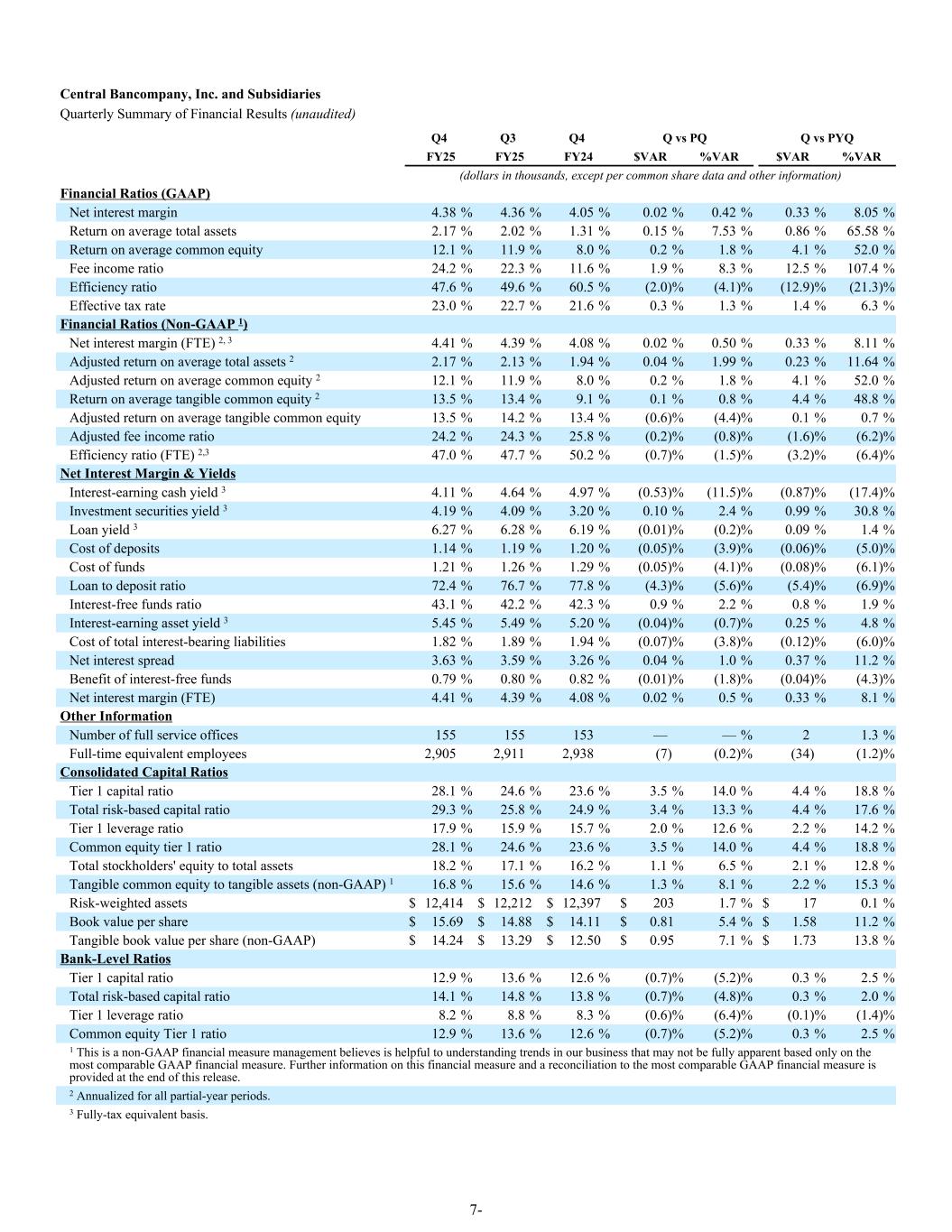 (dollars in thousands, except per common share data and other information) Financial Ratios (GAAP) Net interest margin 4.38 % 4.36 % 4.05 % 0.02 % 0.42 % 0.33 % 8.05 % Return on average total assets 2.17 % 2.02 % 1.31 % 0.15 % 7.53 % 0.86 % 65.58 % Return on average common equity 12.1 % 11.9 % 8.0 % 0.2 % 1.8 % 4.1 % 52.0 % Fee income ratio 24.2 % 22.3 % 11.6 % 1.9 % 8.3 % 12.5 % 107.4 % Efficiency ratio 47.6 % 49.6 % 60.5 % (2.0) % (4.1) % (12.9) % (21.3) % Effective tax rate 23.0 % 22.7 % 21.6 % 0.3 % 1.3 % 1.4 % 6.3 % Financial Ratios (Non-GAAP 1) Net interest margin (FTE) 2, 3 4.41 % 4.39 % 4.08 % 0.02 % 0.50 % 0.33 % 8.11 % Adjusted return on average total assets 2 2.17 % 2.13 % 1.94 % 0.04 % 1.99 % 0.23 % 11.64 % Adjusted return on average common equity 2 12.1 % 11.9 % 8.0 % 0.2 % 1.8 % 4.1 % 52.0 % Return on average tangible common equity 2 13.5 % 13.4 % 9.1 % 0.1 % 0.8 % 4.4 % 48.8 % Adjusted return on average tangible common equity 13.5 % 14.2 % 13.4 % (0.6) % (4.4) % 0.1 % 0.7 % Adjusted fee income ratio 24.2 % 24.3 % 25.8 % (0.2) % (0.8) % (1.6) % (6.2) % Efficiency ratio (FTE) 2,3 47.0 % 47.7 % 50.2 % (0.7) % (1.5) % (3.2) % (6.4) % Net Interest Margin & Yields Interest-earning cash yield 3 4.11 % 4.64 % 4.97 % (0.53) % (11.5) % (0.87) % (17.4) % Investment securities yield 3 4.19 % 4.09 % 3.20 % 0.10 % 2.4 % 0.99 % 30.8 % Loan yield 3 6.27 % 6.28 % 6.19 % (0.01) % (0.2) % 0.09 % 1.4 % Cost of deposits 1.14 % 1.19 % 1.20 % (0.05) % (3.9) % (0.06) % (5.0) % Cost of funds 1.21 % 1.26 % 1.29 % (0.05) % (4.1) % (0.08) % (6.1) % Loan to deposit ratio 72.4 % 76.7 % 77.8 % (4.3) % (5.6) % (5.4) % (6.9) % Interest-free funds ratio 43.1 % 42.2 % 42.3 % 0.9 % 2.2 % 0.8 % 1.9 % Interest-earning asset yield 3 5.45 % 5.49 % 5.20 % (0.04) % (0.7) % 0.25 % 4.8 % Cost of total interest-bearing liabilities 1.82 % 1.89 % 1.94 % (0.07) % (3.8) % (0.12) % (6.0) % Net interest spread 3.63 % 3.59 % 3.26 % 0.04 % 1.0 % 0.37 % 11.2 % Benefit of interest-free funds 0.79 % 0.80 % 0.82 % (0.01) % (1.8) % (0.04) % (4.3) % Net interest margin (FTE) 4.41 % 4.39 % 4.08 % 0.02 % 0.5 % 0.33 % 8.1 % Other Information Number of full service offices 155 155 153 — — % 2 1.3 % Full-time equivalent employees 2,905 2,911 2,938 (7) (0.2) % (34) (1.2) % Consolidated Capital Ratios Tier 1 capital ratio 28.1 % 24.6 % 23.6 % 3.5 % 14.0 % 4.4 % 18.8 % Total risk-based capital ratio 29.3 % 25.8 % 24.9 % 3.4 % 13.3 % 4.4 % 17.6 % Tier 1 leverage ratio 17.9 % 15.9 % 15.7 % 2.0 % 12.6 % 2.2 % 14.2 % Common equity tier 1 ratio 28.1 % 24.6 % 23.6 % 3.5 % 14.0 % 4.4 % 18.8 % Total stockholders' equity to total assets 18.2 % 17.1 % 16.2 % 1.1 % 6.5 % 2.1 % 12.8 % Tangible common equity to tangible assets (non-GAAP) 1 16.8 % 15.6 % 14.6 % 1.3 % 8.1 % 2.2 % 15.3 % Risk-weighted assets $ 12,414 $ 12,212 $ 12,397 $ 203 1.7 % $ 17 0.1 % Book value per share $ 15.69 $ 14.88 $ 14.11 $ 0.81 5.4 % $ 1.58 11.2 % Tangible book value per share (non-GAAP) $ 14.24 $ 13.29 $ 12.50 $ 0.95 7.1 % $ 1.73 13.8 % Bank-Level Ratios Tier 1 capital ratio 12.9 % 13.6 % 12.6 % (0.7) % (5.2) % 0.3 % 2.5 % Total risk-based capital ratio 14.1 % 14.8 % 13.8 % (0.7) % (4.8) % 0.3 % 2.0 % Tier 1 leverage ratio 8.2 % 8.8 % 8.3 % (0.6) % (6.4) % (0.1) % (1.4) % Common equity Tier 1 ratio 12.9 % 13.6 % 12.6 % (0.7) % (5.2) % 0.3 % 2.5 % 1 This is a non-GAAP financial measure management believes is helpful to understanding trends in our business that may not be fully apparent based only on the most comparable GAAP financial measure. Further information on this financial measure and a reconciliation to the most comparable GAAP financial measure is provided at the end of this release. 2 Annualized for all partial-year periods. 3 Fully-tax equivalent basis. Central Bancompany, Inc. and Subsidiaries Quarterly Summary of Financial Results (unaudited) Q4 Q3 Q4 Q vs PQ Q vs PYQ FY25 FY25 FY24 $VAR %VAR $VAR %VAR 7-