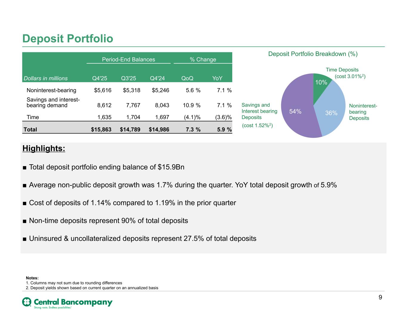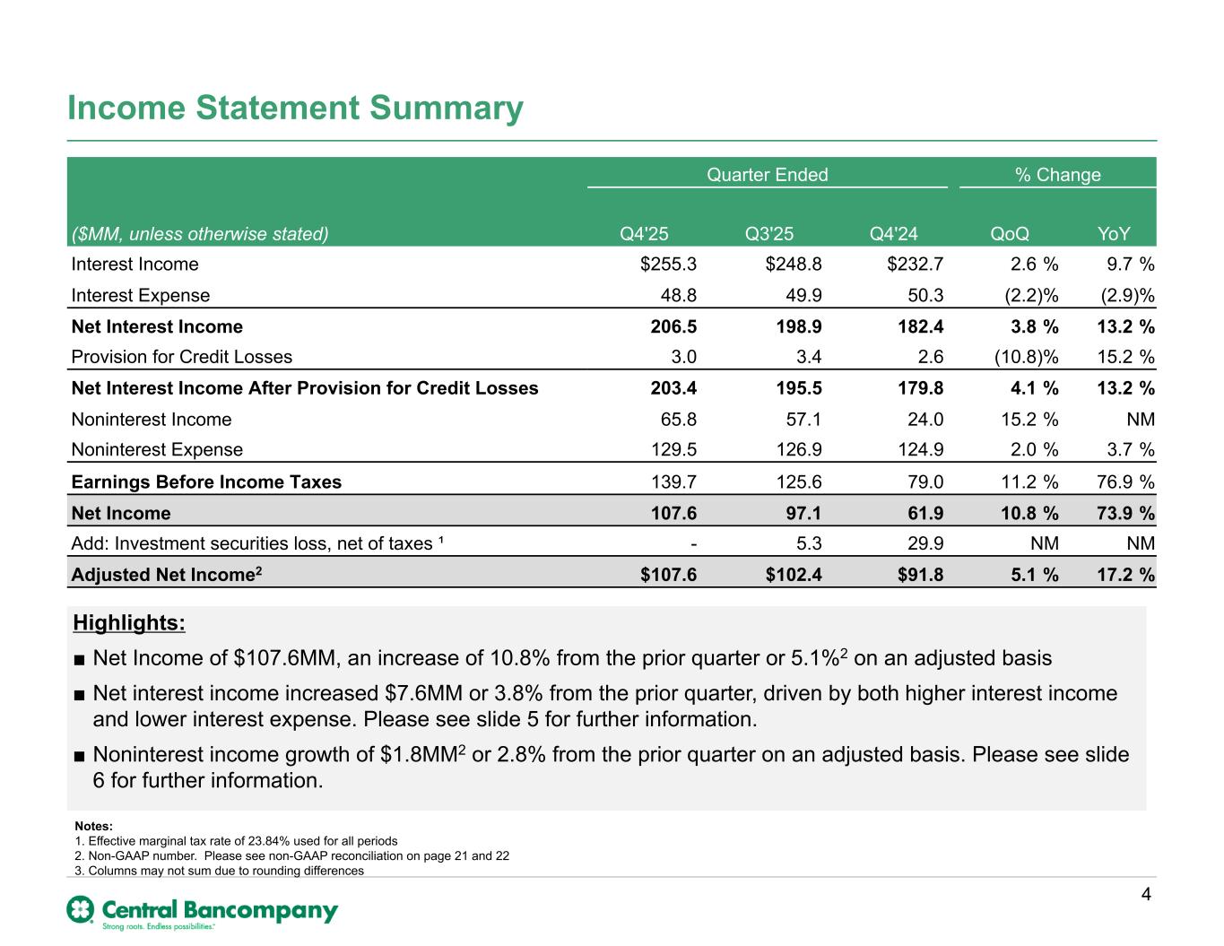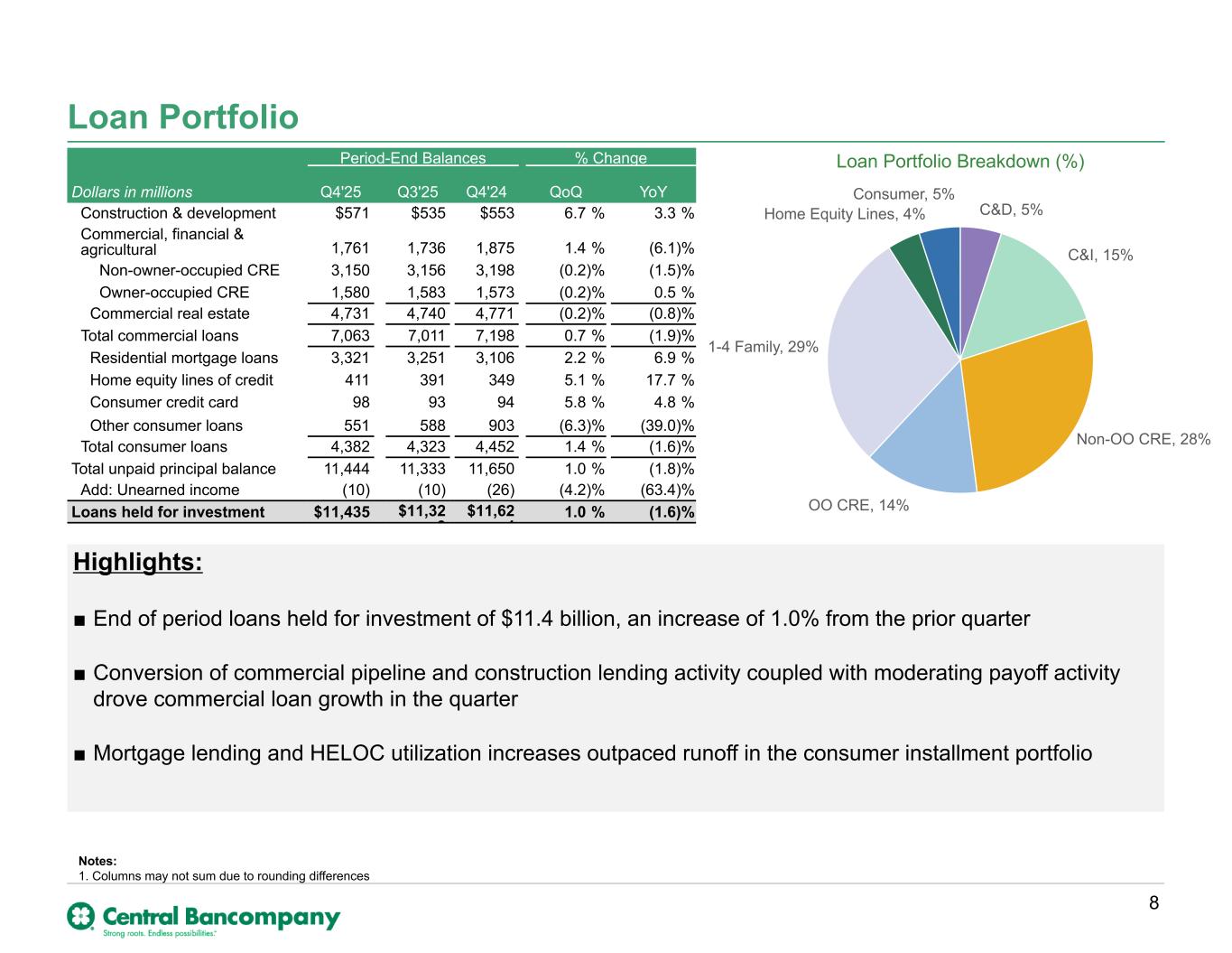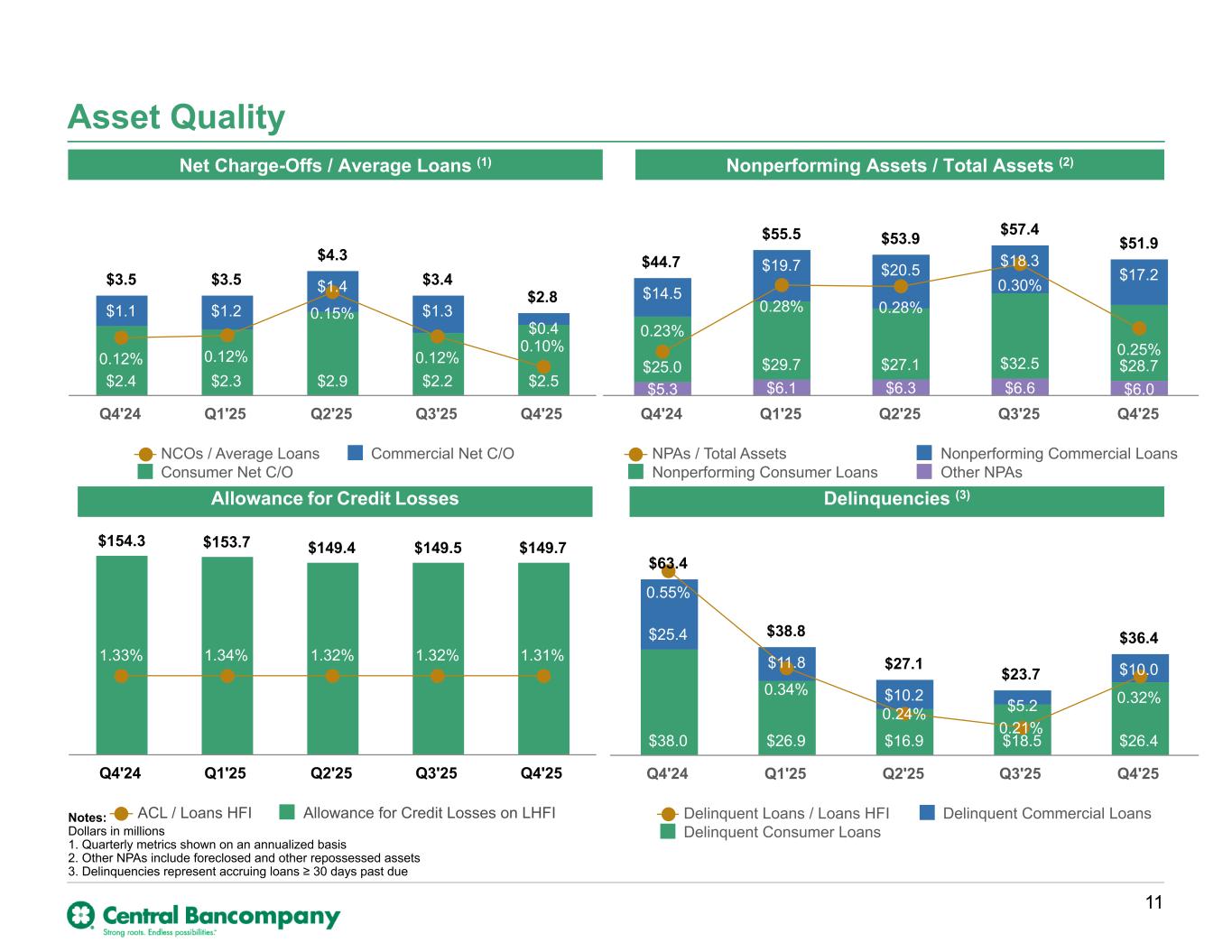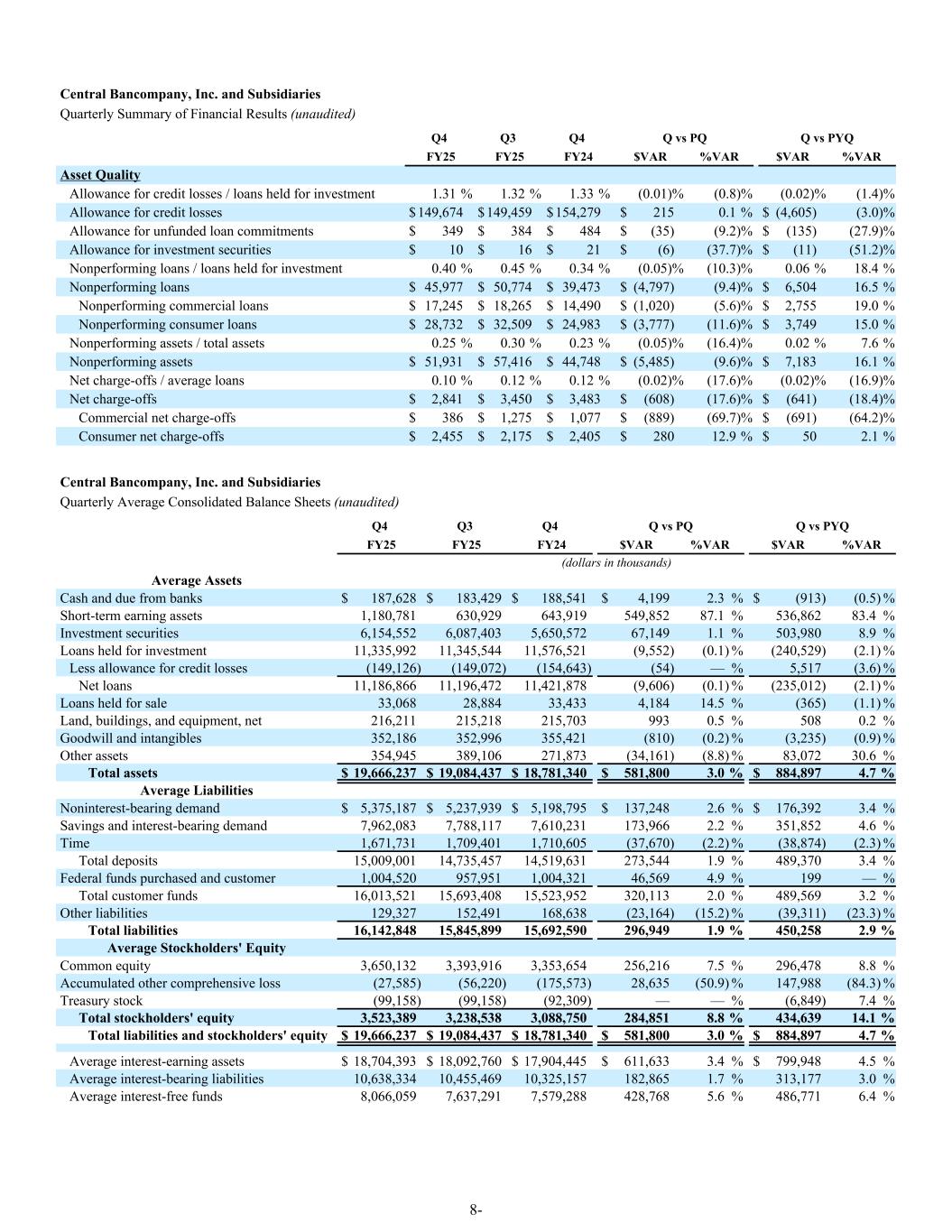 Asset Quality Allowance for credit losses / loans held for investment 1.31 % 1.32 % 1.33 % (0.01) % (0.8) % (0.02) % (1.4) % Allowance for credit losses $ 149,674 $ 149,459 $ 154,279 $ 215 0.1 % $ (4,605) (3.0) % Allowance for unfunded loan commitments $ 349 $ 384 $ 484 $ (35) (9.2) % $ (135) (27.9) % Allowance for investment securities $ 10 $ 16 $ 21 $ (6) (37.7) % $ (11) (51.2) % Nonperforming loans / loans held for investment 0.40 % 0.45 % 0.34 % (0.05) % (10.3) % 0.06 % 18.4 % Nonperforming loans $ 45,977 $ 50,774 $ 39,473 $ (4,797) (9.4) % $ 6,504 16.5 % Nonperforming commercial loans $ 17,245 $ 18,265 $ 14,490 $ (1,020) (5.6) % $ 2,755 19.0 % Nonperforming consumer loans $ 28,732 $ 32,509 $ 24,983 $ (3,777) (11.6) % $ 3,749 15.0 % Nonperforming assets / total assets 0.25 % 0.30 % 0.23 % (0.05) % (16.4) % 0.02 % 7.6 % Nonperforming assets $ 51,931 $ 57,416 $ 44,748 $ (5,485) (9.6) % $ 7,183 16.1 % Net charge-offs / average loans 0.10 % 0.12 % 0.12 % (0.02) % (17.6) % (0.02) % (16.9) % Net charge-offs $ 2,841 $ 3,450 $ 3,483 $ (608) (17.6) % $ (641) (18.4) % Commercial net charge-offs $ 386 $ 1,275 $ 1,077 $ (889) (69.7) % $ (691) (64.2) % Consumer net charge-offs $ 2,455 $ 2,175 $ 2,405 $ 280 12.9 % $ 50 2.1 % Central Bancompany, Inc. and Subsidiaries Quarterly Summary of Financial Results (unaudited) Q4 Q3 Q4 Q vs PQ Q vs PYQ FY25 FY25 FY24 $VAR %VAR $VAR %VAR Central Bancompany, Inc. and Subsidiaries Quarterly Average Consolidated Balance Sheets (unaudited) Q4 Q3 Q4 Q vs PQ Q vs PYQ FY25 FY25 FY24 $VAR %VAR $VAR %VAR (dollars in thousands) Average Assets Cash and due from banks $ 187,628 $ 183,429 $ 188,541 $ 4,199 2.3 % $ (913) (0.5) % Short-term earning assets 1,180,781 630,929 643,919 549,852 87.1 % 536,862 83.4 % Investment securities 6,154,552 6,087,403 5,650,572 67,149 1.1 % 503,980 8.9 % Loans held for investment 11,335,992 11,345,544 11,576,521 (9,552) (0.1) % (240,529) (2.1) % Less allowance for credit losses (149,126) (149,072) (154,643) (54) — % 5,517 (3.6) % Net loans 11,186,866 11,196,472 11,421,878 (9,606) (0.1) % (235,012) (2.1) % Loans held for sale 33,068 28,884 33,433 4,184 14.5 % (365) (1.1) % Land, buildings, and equipment, net 216,211 215,218 215,703 993 0.5 % 508 0.2 % Goodwill and intangibles 352,186 352,996 355,421 (810) (0.2) % (3,235) (0.9) % Other assets 354,945 389,106 271,873 (34,161) (8.8) % 83,072 30.6 % Total assets $ 19,666,237 $ 19,084,437 $ 18,781,340 $ 581,800 3.0 % $ 884,897 4.7 % Average Liabilities Noninterest-bearing demand $ 5,375,187 $ 5,237,939 $ 5,198,795 $ 137,248 2.6 % $ 176,392 3.4 % Savings and interest-bearing demand 7,962,083 7,788,117 7,610,231 173,966 2.2 % 351,852 4.6 % Time 1,671,731 1,709,401 1,710,605 (37,670) (2.2) % (38,874) (2.3) % Total deposits 15,009,001 14,735,457 14,519,631 273,544 1.9 % 489,370 3.4 % Federal funds purchased and customer 1,004,520 957,951 1,004,321 46,569 4.9 % 199 — % Total customer funds 16,013,521 15,693,408 15,523,952 320,113 2.0 % 489,569 3.2 % Other liabilities 129,327 152,491 168,638 (23,164) (15.2) % (39,311) (23.3) % Total liabilities 16,142,848 15,845,899 15,692,590 296,949 1.9 % 450,258 2.9 % Average Stockholders' Equity Common equity 3,650,132 3,393,916 3,353,654 256,216 7.5 % 296,478 8.8 % Accumulated other comprehensive loss (27,585) (56,220) (175,573) 28,635 (50.9) % 147,988 (84.3) % Treasury stock (99,158) (99,158) (92,309) — — % (6,849) 7.4 % Total stockholders' equity 3,523,389 3,238,538 3,088,750 284,851 8.8 % 434,639 14.1 % Total liabilities and stockholders' equity $ 19,666,237 $ 19,084,437 $ 18,781,340 $ 581,800 3.0 % $ 884,897 4.7 % Average interest-earning assets $ 18,704,393 $ 18,092,760 $ 17,904,445 $ 611,633 3.4 % $ 799,948 4.5 % Average interest-bearing liabilities 10,638,334 10,455,469 10,325,157 182,865 1.7 % 313,177 3.0 % Average interest-free funds 8,066,059 7,637,291 7,579,288 428,768 5.6 % 486,771 6.4 % 8-