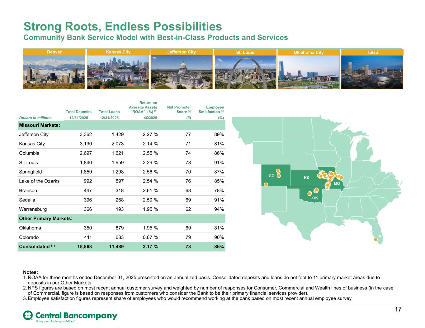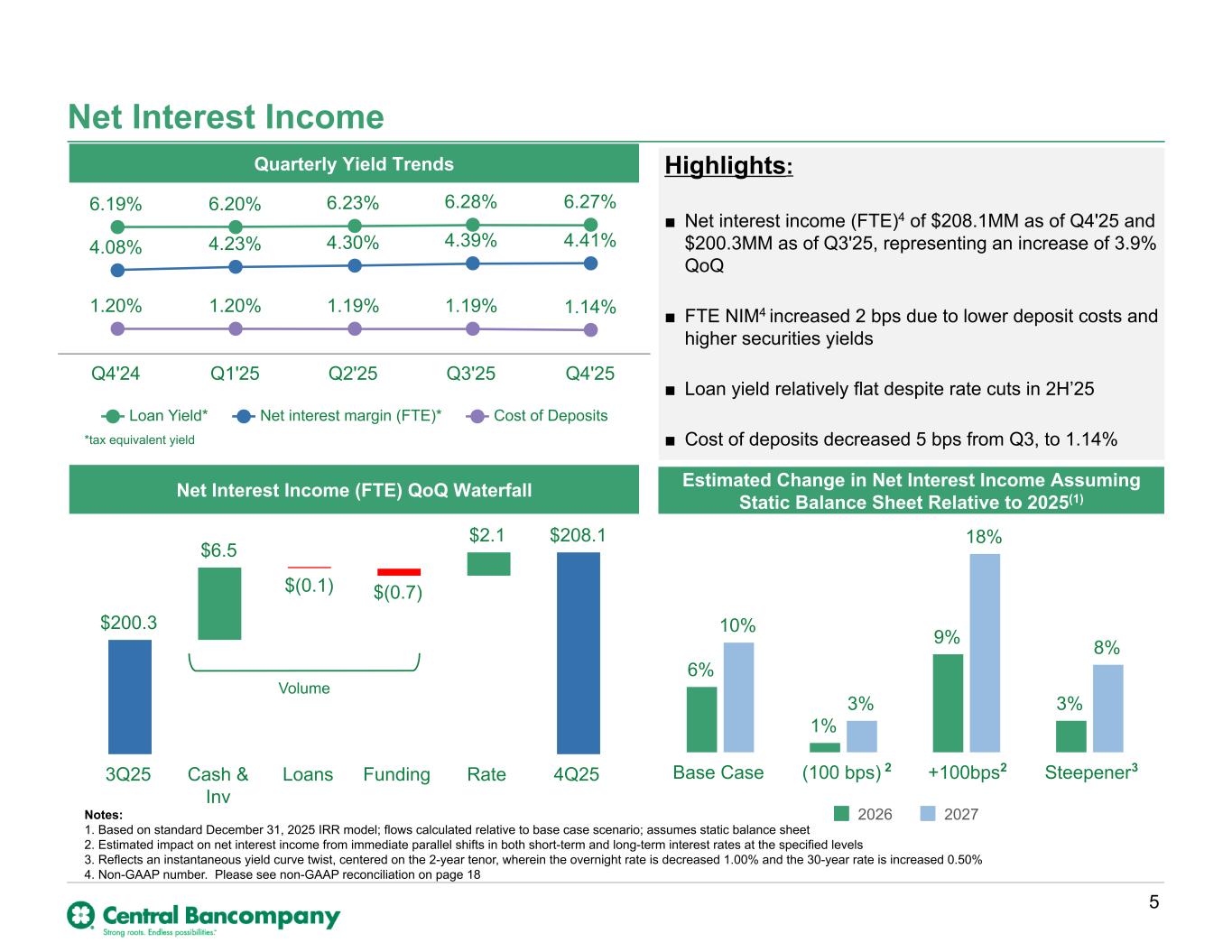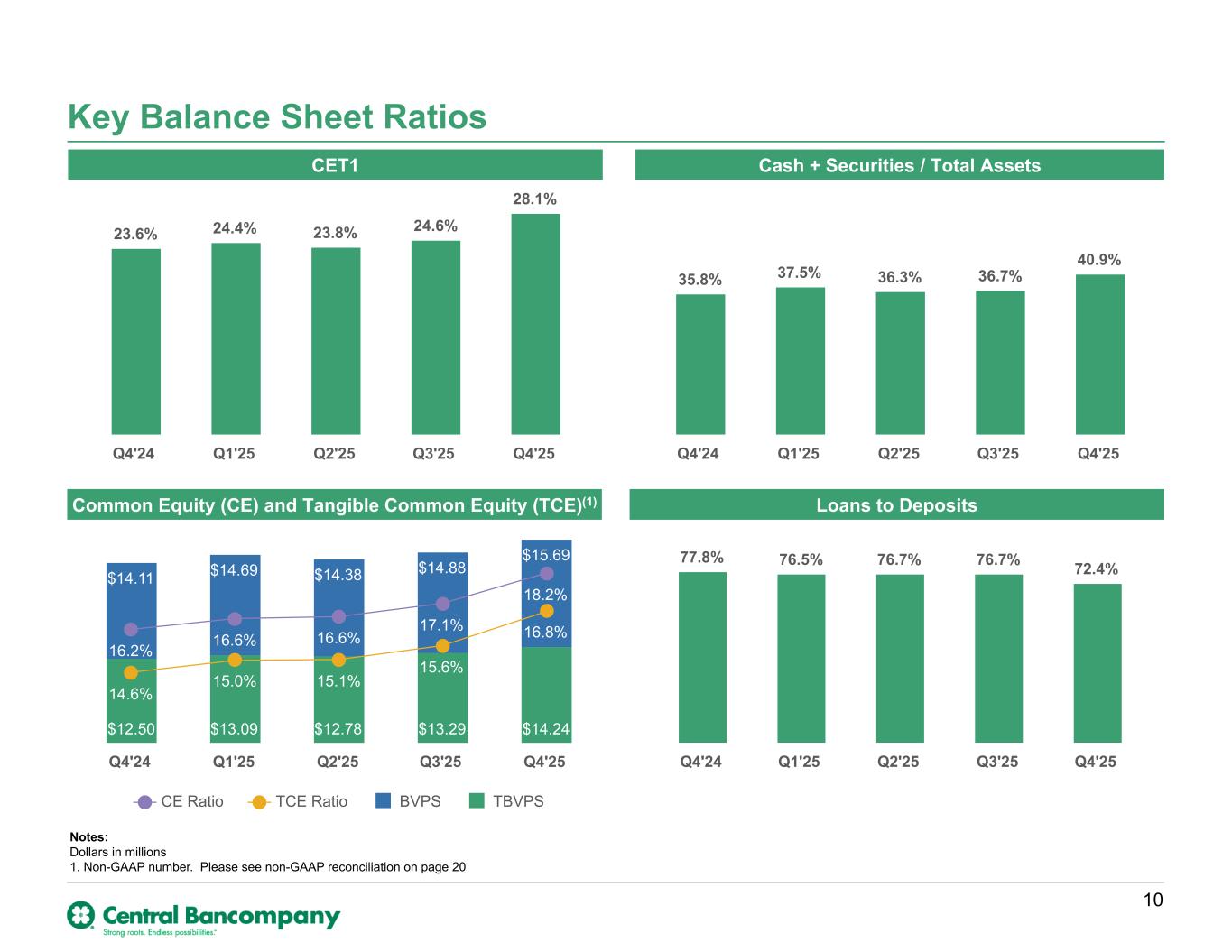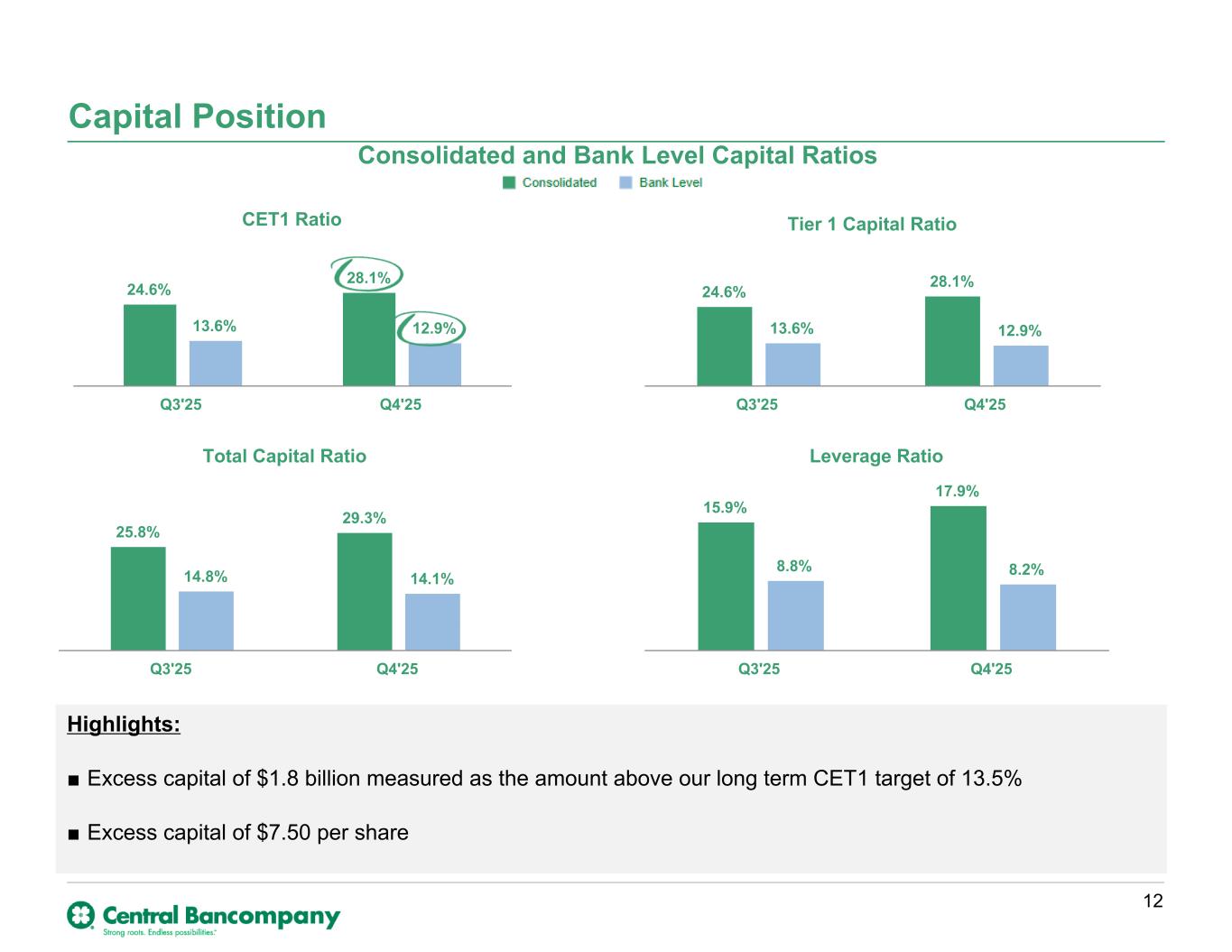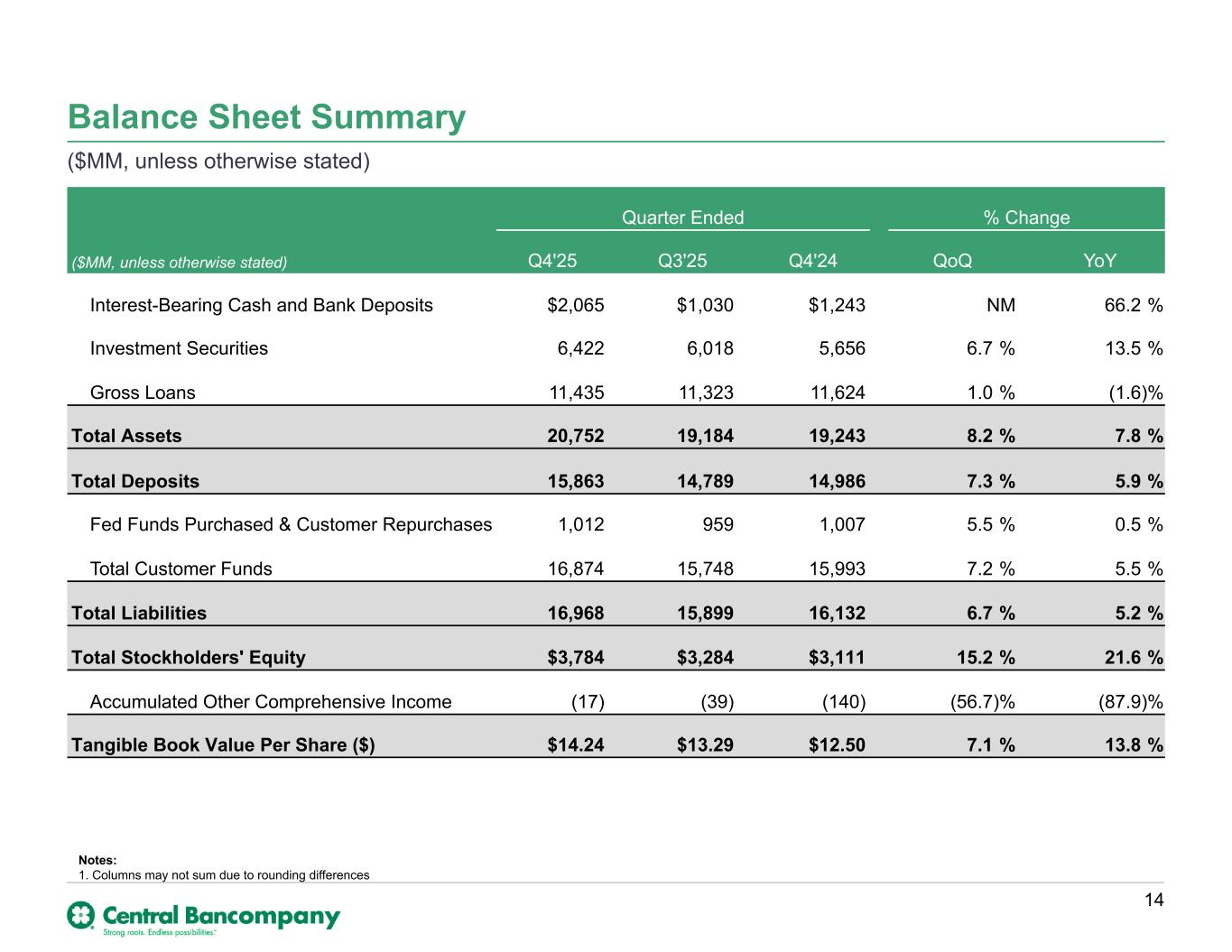 Asset Quality Allowance for credit losses / loans held for investment 1.31 % 1.32 % 1.33 % (0.01) % (0.8) % (0.02) % (1.4) % Allowance for credit losses $ 149,674 $ 149,459 $ 154,279 $ 215 0.1 % $ (4,605) (3.0) % Allowance for unfunded loan commitments $ 349 $ 384 $ 484 $ (35) (9.2) % $ (135) (27.9) % Allowance for investment securities $ 10 $ 16 $ 21 $ (6) (37.7) % $ (11) (51.2) % Nonperforming loans / loans held for investment 0.40 % 0.45 % 0.34 % (0.05) % (10.3) % 0.06 % 18.4 % Nonperforming loans $ 45,977 $ 50,774 $ 39,473 $ (4,797) (9.4) % $ 6,504 16.5 % Nonperforming commercial loans $ 17,245 $ 18,265 $ 14,490 $ (1,020) (5.6) % $ 2,755 19.0 % Nonperforming consumer loans $ 28,732 $ 32,509 $ 24,983 $ (3,777) (11.6) % $ 3,749 15.0 % Nonperforming assets / total assets 0.25 % 0.30 % 0.23 % (0.05) % (16.4) % 0.02 % 7.6 % Nonperforming assets $ 51,931 $ 57,416 $ 44,748 $ (5,485) (9.6) % $ 7,183 16.1 % Net charge-offs / average loans 0.10 % 0.12 % 0.12 % (0.02) % (17.6) % (0.02) % (16.9) % Net charge-offs $ 2,841 $ 3,450 $ 3,483 $ (608) (17.6) % $ (641) (18.4) % Commercial net charge-offs $ 386 $ 1,275 $ 1,077 $ (889) (69.7) % $ (691) (64.2) % Consumer net charge-offs $ 2,455 $ 2,175 $ 2,405 $ 280 12.9 % $ 50 2.1 % Central Bancompany, Inc. and Subsidiaries Quarterly Summary of Financial Results (unaudited) Q4 Q3 Q4 Q vs PQ Q vs PYQ FY25 FY25 FY24 $VAR %VAR $VAR %VAR Central Bancompany, Inc. and Subsidiaries Quarterly Average Consolidated Balance Sheets (unaudited) Q4 Q3 Q4 Q vs PQ Q vs PYQ FY25 FY25 FY24 $VAR %VAR $VAR %VAR (dollars in thousands) Average Assets Cash and due from banks $ 187,628 $ 183,429 $ 188,541 $ 4,199 2.3 % $ (913) (0.5) % Short-term earning assets 1,180,781 630,929 643,919 549,852 87.1 % 536,862 83.4 % Investment securities 6,154,552 6,087,403 5,650,572 67,149 1.1 % 503,980 8.9 % Loans held for investment 11,335,992 11,345,544 11,576,521 (9,552) (0.1) % (240,529) (2.1) % Less allowance for credit losses (149,126) (149,072) (154,643) (54) — % 5,517 (3.6) % Net loans 11,186,866 11,196,472 11,421,878 (9,606) (0.1) % (235,012) (2.1) % Loans held for sale 33,068 28,884 33,433 4,184 14.5 % (365) (1.1) % Land, buildings, and equipment, net 216,211 215,218 215,703 993 0.5 % 508 0.2 % Goodwill and intangibles 352,186 352,996 355,421 (810) (0.2) % (3,235) (0.9) % Other assets 354,945 389,106 271,873 (34,161) (8.8) % 83,072 30.6 % Total assets $ 19,666,237 $ 19,084,437 $ 18,781,340 $ 581,800 3.0 % $ 884,897 4.7 % Average Liabilities Noninterest-bearing demand $ 5,375,187 $ 5,237,939 $ 5,198,795 $ 137,248 2.6 % $ 176,392 3.4 % Savings and interest-bearing demand 7,962,083 7,788,117 7,610,231 173,966 2.2 % 351,852 4.6 % Time 1,671,731 1,709,401 1,710,605 (37,670) (2.2) % (38,874) (2.3) % Total deposits 15,009,001 14,735,457 14,519,631 273,544 1.9 % 489,370 3.4 % Federal funds purchased and customer 1,004,520 957,951 1,004,321 46,569 4.9 % 199 — % Total customer funds 16,013,521 15,693,408 15,523,952 320,113 2.0 % 489,569 3.2 % Other liabilities 129,327 152,491 168,638 (23,164) (15.2) % (39,311) (23.3) % Total liabilities 16,142,848 15,845,899 15,692,590 296,949 1.9 % 450,258 2.9 % Average Stockholders' Equity Common equity 3,650,132 3,393,916 3,353,654 256,216 7.5 % 296,478 8.8 % Accumulated other comprehensive loss (27,585) (56,220) (175,573) 28,635 (50.9) % 147,988 (84.3) % Treasury stock (99,158) (99,158) (92,309) — — % (6,849) 7.4 % Total stockholders' equity 3,523,389 3,238,538 3,088,750 284,851 8.8 % 434,639 14.1 % Total liabilities and stockholders' equity $ 19,666,237 $ 19,084,437 $ 18,781,340 $ 581,800 3.0 % $ 884,897 4.7 % Average interest-earning assets $ 18,704,393 $ 18,092,760 $ 17,904,445 $ 611,633 3.4 % $ 799,948 4.5 % Average interest-bearing liabilities 10,638,334 10,455,469 10,325,157 182,865 1.7 % 313,177 3.0 % Average interest-free funds 8,066,059 7,637,291 7,579,288 428,768 5.6 % 486,771 6.4 % 8-