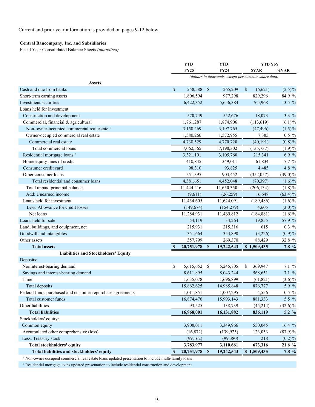 Current and prior year information is provided on pages 9-12 below. Central Bancompany, Inc. and Subsidiaries Fiscal Year Consolidated Balance Sheets (unaudited) YTD YTD YTD YoY FY25 FY24 $VAR %VAR (dollars in thousands, except per common share data) Assets Cash and due from banks $ 258,588 $ 265,209 $ (6,621) (2.5) % Short-term earning assets 1,806,594 977,298 829,296 84.9 % Investment securities 6,422,352 5,656,384 765,968 13.5 % Loans held for investment: Construction and development 570,749 552,676 18,073 3.3 % Commercial, financial & agricultural 1,761,287 1,874,906 (113,619) (6.1) % Non-owner-occupied commercial real estate 1 3,150,269 3,197,765 (47,496) (1.5) % Owner-occupied commercial real estate 1,580,260 1,572,955 7,305 0.5 % Commercial real estate 4,730,529 4,770,720 (40,191) (0.8) % Total commercial loans 7,062,565 7,198,302 (135,737) (1.9) % Residential mortgage loans 2 3,321,101 3,105,760 215,341 6.9 % Home equity lines of credit 410,845 349,011 61,834 17.7 % Consumer credit card 98,310 93,825 4,485 4.8 % Other consumer loans 551,395 903,452 (352,057) (39.0) % Total residential and consumer loans 4,381,651 4,452,048 (70,397) (1.6) % Total unpaid principal balance 11,444,216 11,650,350 (206,134) (1.8) % Add: Unearned income (9,611) (26,259) 16,648 (63.4) % Loans held for investment 11,434,605 11,624,091 (189,486) (1.6) % Less: Allowance for credit losses (149,674) (154,279) 4,605 (3.0) % Net loans 11,284,931 11,469,812 (184,881) (1.6) % Loans held for sale 54,119 34,264 19,855 57.9 % Land, buildings, and equipment, net 215,931 215,316 615 0.3 % Goodwill and intangibles 351,664 354,890 (3,226) (0.9) % Other assets 357,799 269,370 88,429 32.8 % Total assets $ 20,751,978 $ 19,242,543 $ 1,509,435 7.8 % Liabilities and Stockholders' Equity Deposits: Noninterest-bearing demand $ 5,615,652 $ 5,245,705 $ 369,947 7.1 % Savings and interest-bearing demand 8,611,895 8,043,244 568,651 7.1 % Time 1,635,078 1,696,899 (61,821) (3.6) % Total deposits 15,862,625 14,985,848 876,777 5.9 % Federal funds purchased and customer repurchase agreements 1,011,851 1,007,295 4,556 0.5 % Total customer funds 16,874,476 15,993,143 881,333 5.5 % Other liabilities 93,525 138,739 (45,214) (32.6) % Total liabilities 16,968,001 16,131,882 836,119 5.2 % Stockholders' equity: Common equity 3,900,011 3,349,966 550,045 16.4 % Accumulated other comprehensive (loss) (16,872) (139,925) 123,053 (87.9) % Less: Treasury stock (99,162) (99,380) 218 (0.2) % Total stockholders' equity 3,783,977 3,110,661 673,316 21.6 % Total liabilities and stockholders' equity $ 20,751,978 $ 19,242,543 $ 1,509,435 7.8 % 1 Non-owner occupied commercial real estate loans updated presentation to include multi-family loans 2 Residential mortgage loans updated presentation to include residential construction and development 9-