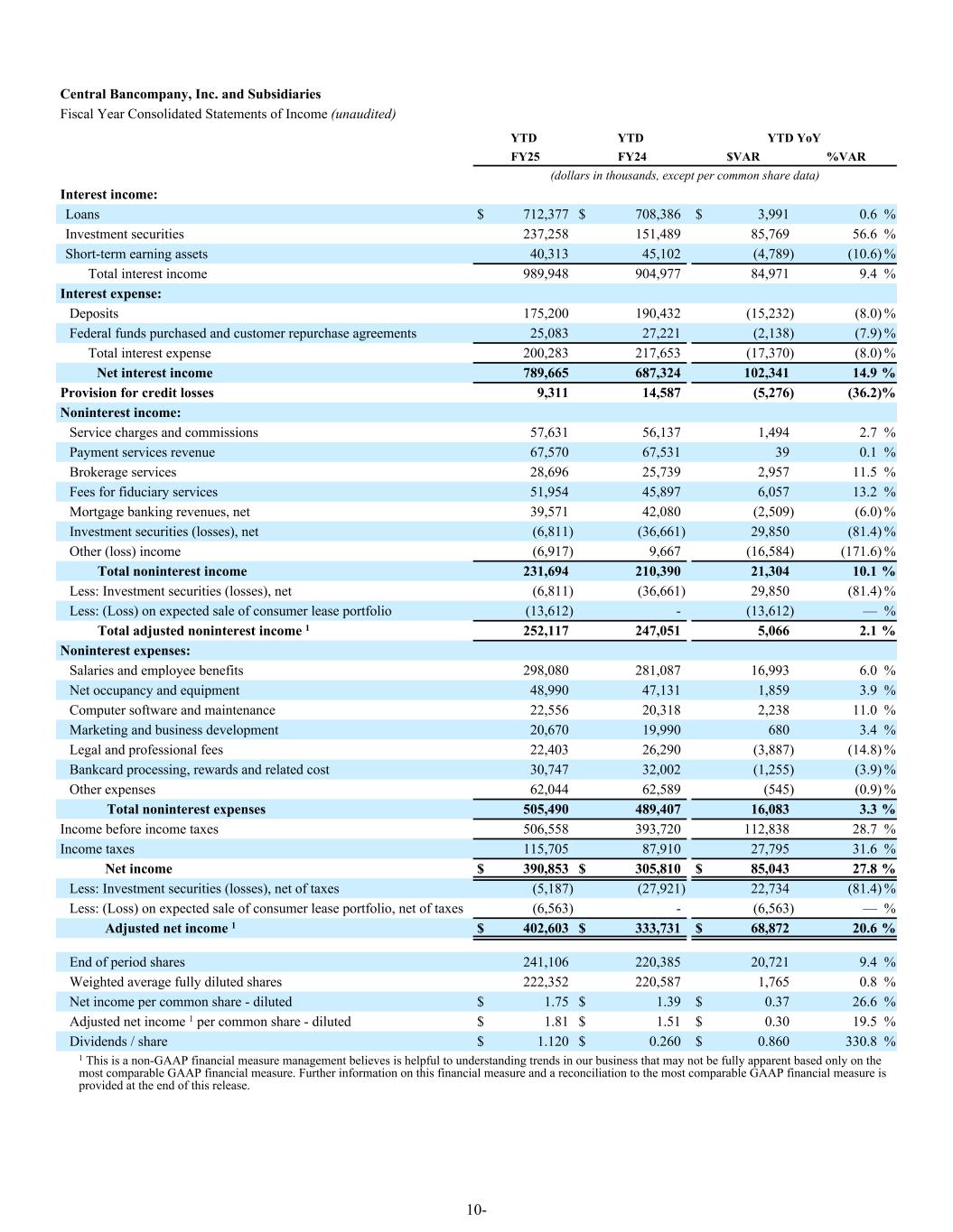 Central Bancompany, Inc. and Subsidiaries Fiscal Year Consolidated Statements of Income (unaudited) YTD YTD YTD YoY FY25 FY24 $VAR %VAR (dollars in thousands, except per common share data) Interest income: Loans $ 712,377 $ 708,386 $ 3,991 0.6 % Investment securities 237,258 151,489 85,769 56.6 % Short-term earning assets 40,313 45,102 (4,789) (10.6) % Total interest income 989,948 904,977 84,971 9.4 % Interest expense: Deposits 175,200 190,432 (15,232) (8.0) % Federal funds purchased and customer repurchase agreements 25,083 27,221 (2,138) (7.9) % Total interest expense 200,283 217,653 (17,370) (8.0) % Net interest income 789,665 687,324 102,341 14.9 % Provision for credit losses 9,311 14,587 (5,276) (36.2) % Noninterest income: Service charges and commissions 57,631 56,137 1,494 2.7 % Payment services revenue 67,570 67,531 39 0.1 % Brokerage services 28,696 25,739 2,957 11.5 % Fees for fiduciary services 51,954 45,897 6,057 13.2 % Mortgage banking revenues, net 39,571 42,080 (2,509) (6.0) % Investment securities (losses), net (6,811) (36,661) 29,850 (81.4) % Other (loss) income (6,917) 9,667 (16,584) (171.6) % Total noninterest income 231,694 210,390 21,304 10.1 % Less: Investment securities (losses), net (6,811) (36,661) 29,850 (81.4) % Less: (Loss) on expected sale of consumer lease portfolio (13,612) - (13,612) — % Total adjusted noninterest income 1 252,117 247,051 5,066 2.1 % Noninterest expenses: Salaries and employee benefits 298,080 281,087 16,993 6.0 % Net occupancy and equipment 48,990 47,131 1,859 3.9 % Computer software and maintenance 22,556 20,318 2,238 11.0 % Marketing and business development 20,670 19,990 680 3.4 % Legal and professional fees 22,403 26,290 (3,887) (14.8) % Bankcard processing, rewards and related cost 30,747 32,002 (1,255) (3.9) % Other expenses 62,044 62,589 (545) (0.9) % Total noninterest expenses 505,490 489,407 16,083 3.3 % Income before income taxes 506,558 393,720 112,838 28.7 % Income taxes 115,705 87,910 27,795 31.6 % Net income $ 390,853 $ 305,810 $ 85,043 27.8 % Less: Investment securities (losses), net of taxes (5,187) (27,921) 22,734 (81.4) % Less: (Loss) on expected sale of consumer lease portfolio, net of taxes (6,563) - (6,563) — % Adjusted net income 1 $ 402,603 $ 333,731 $ 68,872 20.6 % End of period shares 241,106 220,385 20,721 9.4 % Weighted average fully diluted shares 222,352 220,587 1,765 0.8 % Net income per common share - diluted $ 1.75 $ 1.39 $ 0.37 26.6 % Adjusted net income 1 per common share - diluted $ 1.81 $ 1.51 $ 0.30 19.5 % Dividends / share $ 1.120 $ 0.260 $ 0.860 330.8 % 1 This is a non-GAAP financial measure management believes is helpful to understanding trends in our business that may not be fully apparent based only on the most comparable GAAP financial measure. Further information on this financial measure and a reconciliation to the most comparable GAAP financial measure is provided at the end of this release. 10-