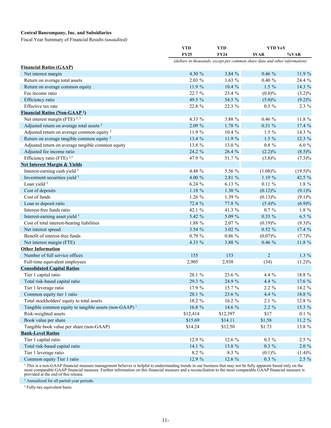 Financial Ratios (GAAP) Net interest margin 4.30 % 3.84 % 0.46 % 11.9 % Return on average total assets 2.03 % 1.63 % 0.40 % 24.4 % Return on average common equity 11.9 % 10.4 % 1.5 % 14.3 % Fee income ratio 22.7 % 23.4 % (0.8) % (3.2) % Efficiency ratio 49.5 % 54.5 % (5.0) % (9.2) % Effective tax rate 22.8 % 22.3 % 0.5 % 2.3 % Financial Ratios (Non-GAAP 1) Net interest margin (FTE) 2, 3 4.33 % 3.88 % 0.46 % 11.8 % Adjusted return on average total assets 2 2.09 % 1.78 % 0.31 % 17.4 % Adjusted return on average common equity 2 11.9 % 10.4 % 1.5 % 14.3 % Return on average tangible common equity 2 13.4 % 11.9 % 1.5 % 12.3 % Adjusted return on average tangible common equity 13.8 % 13.0 % 0.8 % 6.0 % Adjusted fee income ratio 24.2 % 26.4 % (2.2) % (8.5) % Efficiency ratio (FTE) 2,3 47.9 % 51.7 % (3.8) % (7.3) % Net Interest Margin & Yields Interest-earning cash yield 3 4.48 % 5.56 % (1.08) % (19.5) % Investment securities yield 3 4.00 % 2.81 % 1.19 % 42.5 % Loan yield 3 6.24 % 6.13 % 0.11 % 1.8 % Cost of deposits 1.18 % 1.30 % (0.12) % (9.1) % Cost of funds 1.26 % 1.39 % (0.13) % (9.1) % Loan to deposit ratio 72.4 % 77.8 % (5.4) % (6.9) % Interest-free funds ratio 42.1 % 41.3 % 0.7 % 1.8 % Interest-earning asset yield 3 5.42 % 5.09 % 0.33 % 6.5 % Cost of total interest-bearing liabilities 1.88 % 2.07 % (0.19) % (9.3) % Net interest spread 3.54 % 3.02 % 0.52 % 17.4 % Benefit of interest-free funds 0.79 % 0.86 % (0.07) % (7.7) % Net interest margin (FTE) 4.33 % 3.88 % 0.46 % 11.8 % Other Information Number of full service offices 155 153 2 1.3 % Full-time equivalent employees 2,905 2,938 (34) (1.2) % Consolidated Capital Ratios Tier 1 capital ratio 28.1 % 23.6 % 4.4 % 18.8 % Total risk-based capital ratio 29.3 % 24.9 % 4.4 % 17.6 % Tier 1 leverage ratio 17.9 % 15.7 % 2.2 % 14.2 % Common equity tier 1 ratio 28.1 % 23.6 % 4.4 % 18.8 % Total stockholders' equity to total assets 18.2 % 16.2 % 2.1 % 12.8 % Tangible common equity to tangible assets (non-GAAP) 1 16.8 % 14.6 % 2.2 % 15.3 % Risk-weighted assets $12,414 $12,397 $17 0.1 % Book value per share $15.69 $14.11 $1.58 11.2 % Tangible book value per share (non-GAAP) $14.24 $12.50 $1.73 13.8 % Bank-Level Ratios Tier 1 capital ratio 12.9 % 12.6 % 0.3 % 2.5 % Total risk-based capital ratio 14.1 % 13.8 % 0.3 % 2.0 % Tier 1 leverage ratio 8.2 % 8.3 % (0.1) % (1.4) % Common equity Tier 1 ratio 12.9 % 12.6 % 0.3 % 2.5 % 1 This is a non-GAAP financial measure management believes is helpful to understanding trends in our business that may not be fully apparent based only on the most comparable GAAP financial measure. Further information on this financial measure and a reconciliation to the most comparable GAAP financial measure is provided at the end of this release. 2 Annualized for all partial-year periods. 3 Fully-tax equivalent basis. Central Bancompany, Inc. and Subsidiaries Fiscal Year Summary of Financial Results (unaudited) YTD YTD YTD YoY FY25 FY24 $VAR %VAR (dollars in thousands, except per common share data and other information) 11-