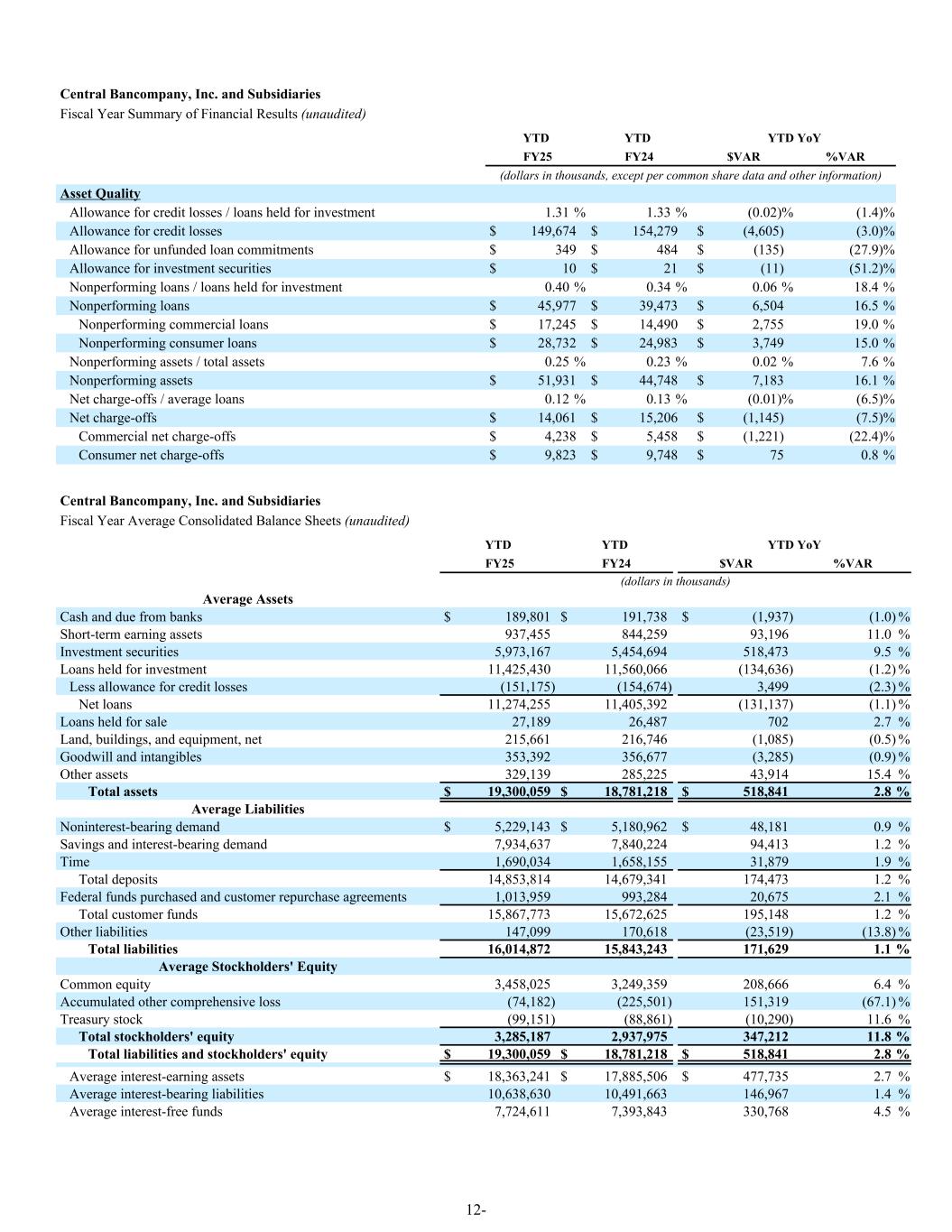 Asset Quality Allowance for credit losses / loans held for investment 1.31 % 1.33 % (0.02) % (1.4) % Allowance for credit losses $ 149,674 $ 154,279 $ (4,605) (3.0) % Allowance for unfunded loan commitments $ 349 $ 484 $ (135) (27.9) % Allowance for investment securities $ 10 $ 21 $ (11) (51.2) % Nonperforming loans / loans held for investment 0.40 % 0.34 % 0.06 % 18.4 % Nonperforming loans $ 45,977 $ 39,473 $ 6,504 16.5 % Nonperforming commercial loans $ 17,245 $ 14,490 $ 2,755 19.0 % Nonperforming consumer loans $ 28,732 $ 24,983 $ 3,749 15.0 % Nonperforming assets / total assets 0.25 % 0.23 % 0.02 % 7.6 % Nonperforming assets $ 51,931 $ 44,748 $ 7,183 16.1 % Net charge-offs / average loans 0.12 % 0.13 % (0.01) % (6.5) % Net charge-offs $ 14,061 $ 15,206 $ (1,145) (7.5) % Commercial net charge-offs $ 4,238 $ 5,458 $ (1,221) (22.4) % Consumer net charge-offs $ 9,823 $ 9,748 $ 75 0.8 % Central Bancompany, Inc. and Subsidiaries Fiscal Year Summary of Financial Results (unaudited) YTD YTD YTD YoY FY25 FY24 $VAR %VAR (dollars in thousands, except per common share data and other information) Central Bancompany, Inc. and Subsidiaries Fiscal Year Average Consolidated Balance Sheets (unaudited) YTD YTD YTD YoY FY25 FY24 $VAR %VAR (dollars in thousands) Average Assets Cash and due from banks $ 189,801 $ 191,738 $ (1,937) (1.0) % Short-term earning assets 937,455 844,259 93,196 11.0 % Investment securities 5,973,167 5,454,694 518,473 9.5 % Loans held for investment 11,425,430 11,560,066 (134,636) (1.2) % Less allowance for credit losses (151,175) (154,674) 3,499 (2.3) % Net loans 11,274,255 11,405,392 (131,137) (1.1) % Loans held for sale 27,189 26,487 702 2.7 % Land, buildings, and equipment, net 215,661 216,746 (1,085) (0.5) % Goodwill and intangibles 353,392 356,677 (3,285) (0.9) % Other assets 329,139 285,225 43,914 15.4 % Total assets $ 19,300,059 $ 18,781,218 $ 518,841 2.8 % Average Liabilities Noninterest-bearing demand $ 5,229,143 $ 5,180,962 $ 48,181 0.9 % Savings and interest-bearing demand 7,934,637 7,840,224 94,413 1.2 % Time 1,690,034 1,658,155 31,879 1.9 % Total deposits 14,853,814 14,679,341 174,473 1.2 % Federal funds purchased and customer repurchase agreements 1,013,959 993,284 20,675 2.1 % Total customer funds 15,867,773 15,672,625 195,148 1.2 % Other liabilities 147,099 170,618 (23,519) (13.8) % Total liabilities 16,014,872 15,843,243 171,629 1.1 % Average Stockholders' Equity Common equity 3,458,025 3,249,359 208,666 6.4 % Accumulated other comprehensive loss (74,182) (225,501) 151,319 (67.1) % Treasury stock (99,151) (88,861) (10,290) 11.6 % Total stockholders' equity 3,285,187 2,937,975 347,212 11.8 % Total liabilities and stockholders' equity $ 19,300,059 $ 18,781,218 $ 518,841 2.8 % Average interest-earning assets $ 18,363,241 $ 17,885,506 $ 477,735 2.7 % Average interest-bearing liabilities 10,638,630 10,491,663 146,967 1.4 % Average interest-free funds 7,724,611 7,393,843 330,768 4.5 % 12-