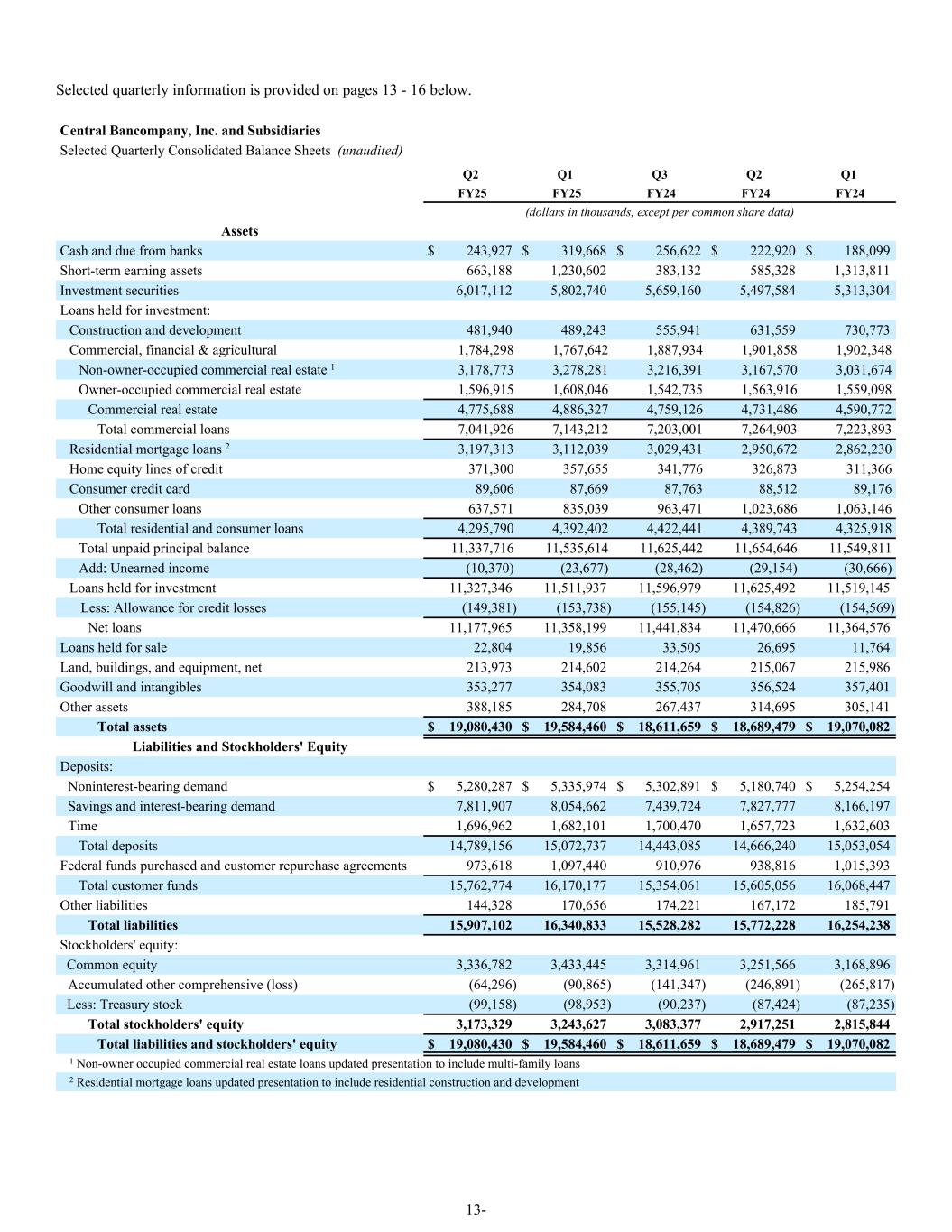 Selected quarterly information is provided on pages 13 - 16 below. Central Bancompany, Inc. and Subsidiaries Selected Quarterly Consolidated Balance Sheets (unaudited) Q2 Q1 Q3 Q2 Q1 FY25 FY25 FY24 FY24 FY24 (dollars in thousands, except per common share data) Assets Cash and due from banks $ 243,927 $ 319,668 $ 256,622 $ 222,920 $ 188,099 Short-term earning assets 663,188 1,230,602 383,132 585,328 1,313,811 Investment securities 6,017,112 5,802,740 5,659,160 5,497,584 5,313,304 Loans held for investment: Construction and development 481,940 489,243 555,941 631,559 730,773 Commercial, financial & agricultural 1,784,298 1,767,642 1,887,934 1,901,858 1,902,348 Non-owner-occupied commercial real estate 1 3,178,773 3,278,281 3,216,391 3,167,570 3,031,674 Owner-occupied commercial real estate 1,596,915 1,608,046 1,542,735 1,563,916 1,559,098 Commercial real estate 4,775,688 4,886,327 4,759,126 4,731,486 4,590,772 Total commercial loans 7,041,926 7,143,212 7,203,001 7,264,903 7,223,893 Residential mortgage loans 2 3,197,313 3,112,039 3,029,431 2,950,672 2,862,230 Home equity lines of credit 371,300 357,655 341,776 326,873 311,366 Consumer credit card 89,606 87,669 87,763 88,512 89,176 Other consumer loans 637,571 835,039 963,471 1,023,686 1,063,146 Total residential and consumer loans 4,295,790 4,392,402 4,422,441 4,389,743 4,325,918 Total unpaid principal balance 11,337,716 11,535,614 11,625,442 11,654,646 11,549,811 Add: Unearned income (10,370) (23,677) (28,462) (29,154) (30,666) Loans held for investment 11,327,346 11,511,937 11,596,979 11,625,492 11,519,145 Less: Allowance for credit losses (149,381) (153,738) (155,145) (154,826) (154,569) Net loans 11,177,965 11,358,199 11,441,834 11,470,666 11,364,576 Loans held for sale 22,804 19,856 33,505 26,695 11,764 Land, buildings, and equipment, net 213,973 214,602 214,264 215,067 215,986 Goodwill and intangibles 353,277 354,083 355,705 356,524 357,401 Other assets 388,185 284,708 267,437 314,695 305,141 Total assets $ 19,080,430 $ 19,584,460 $ 18,611,659 $ 18,689,479 $ 19,070,082 Liabilities and Stockholders' Equity Deposits: Noninterest-bearing demand $ 5,280,287 $ 5,335,974 $ 5,302,891 $ 5,180,740 $ 5,254,254 Savings and interest-bearing demand 7,811,907 8,054,662 7,439,724 7,827,777 8,166,197 Time 1,696,962 1,682,101 1,700,470 1,657,723 1,632,603 Total deposits 14,789,156 15,072,737 14,443,085 14,666,240 15,053,054 Federal funds purchased and customer repurchase agreements 973,618 1,097,440 910,976 938,816 1,015,393 Total customer funds 15,762,774 16,170,177 15,354,061 15,605,056 16,068,447 Other liabilities 144,328 170,656 174,221 167,172 185,791 Total liabilities 15,907,102 16,340,833 15,528,282 15,772,228 16,254,238 Stockholders' equity: Common equity 3,336,782 3,433,445 3,314,961 3,251,566 3,168,896 Accumulated other comprehensive (loss) (64,296) (90,865) (141,347) (246,891) (265,817) Less: Treasury stock (99,158) (98,953) (90,237) (87,424) (87,235) Total stockholders' equity 3,173,329 3,243,627 3,083,377 2,917,251 2,815,844 Total liabilities and stockholders' equity $ 19,080,430 $ 19,584,460 $ 18,611,659 $ 18,689,479 $ 19,070,082 1 Non-owner occupied commercial real estate loans updated presentation to include multi-family loans 2 Residential mortgage loans updated presentation to include residential construction and development 13-