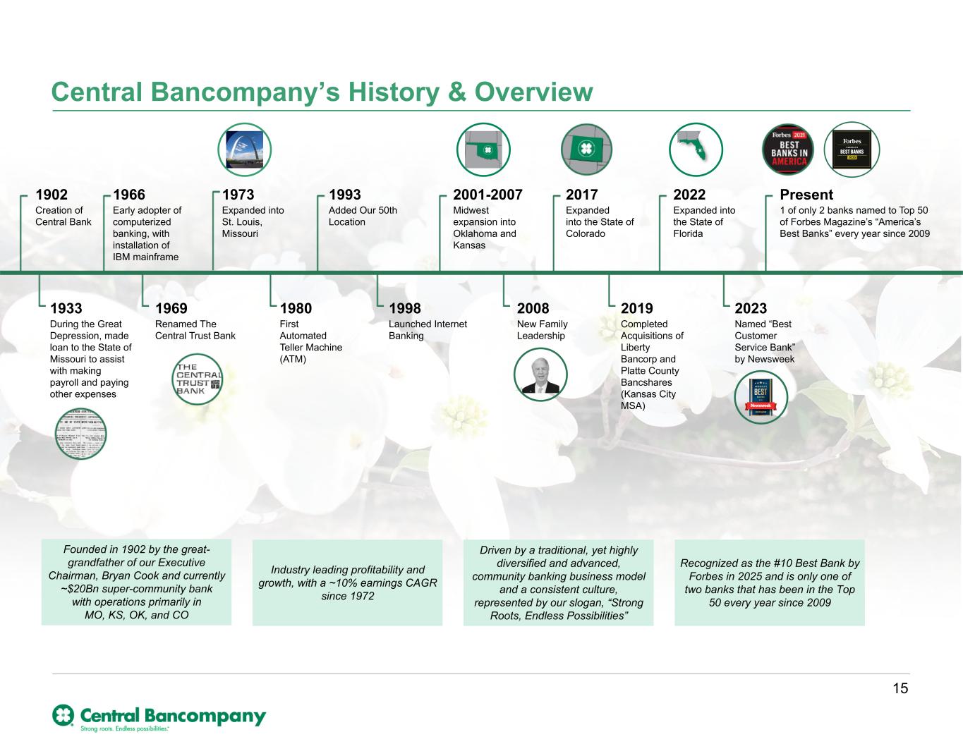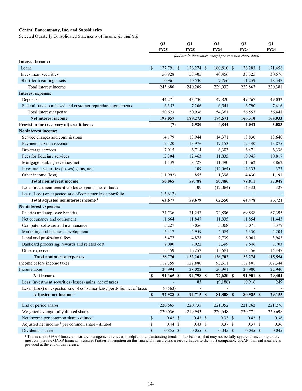 Central Bancompany, Inc. and Subsidiaries Selected Quarterly Consolidated Statements of Income (unaudited) Q2 Q1 Q3 Q2 Q1 FY25 FY25 FY24 FY24 FY24 (dollars in thousands, except per common share data) Interest income: Loans $ 177,791 $ 176,274 $ 180,810 $ 176,283 $ 171,458 Investment securities 56,928 53,405 40,456 35,325 30,576 Short-term earning assets 10,961 10,530 7,766 11,259 18,347 Total interest income 245,680 240,209 229,032 222,867 220,381 Interest expense: Deposits 44,271 43,730 47,820 49,767 49,032 Federal funds purchased and customer repurchase agreements 6,352 7,206 6,541 6,790 7,416 Total interest expense 50,623 50,936 54,361 56,557 56,448 Net interest income 195,057 189,273 174,671 166,310 163,933 Provision for (recovery of) credit losses (7) 2,920 4,844 4,042 3,083 Noninterest income: Service charges and commissions 14,179 13,944 14,371 13,830 13,640 Payment services revenue 17,420 15,976 17,153 17,440 15,875 Brokerage services 7,015 6,714 6,303 6,471 6,336 Fees for fiduciary services 12,304 12,463 11,835 10,945 10,817 Mortgage banking revenues, net 11,139 8,727 11,490 11,362 8,862 Investment securities (losses) gains, net - 109 (12,064) 14,333 327 Other income (loss) (11,992) 855 1,398 4,430 1,191 Total noninterest income 50,065 58,788 50,486 78,811 57,048 Less: Investment securities (losses) gains, net of taxes - 109 (12,064) 14,333 327 Less: (Loss) on expected sale of consumer lease portfolio (13,612) - - - - Total adjusted noninterest income 1 63,677 58,679 62,550 64,478 56,721 Noninterest expenses: Salaries and employee benefits 74,736 71,247 72,896 69,858 67,395 Net occupancy and equipment 11,664 11,847 11,835 11,854 11,443 Computer software and maintenance 5,227 6,056 5,068 5,071 5,379 Marketing and business development 5,417 4,959 5,084 5,330 4,204 Legal and professional fees 5,477 4,878 7,739 6,063 3,983 Bankcard processing, rewards and related cost 8,090 7,022 8,399 8,646 8,703 Other expenses 16,159 16,252 15,681 15,456 14,447 Total noninterest expenses 126,770 122,261 126,702 122,278 115,554 Income before income taxes 118,359 122,880 93,611 118,801 102,344 Income taxes 26,994 28,082 20,991 26,900 22,940 Net income $ 91,365 $ 94,798 $ 72,620 $ 91,901 $ 79,404 Less: Investment securities (losses) gains, net of taxes - 83 (9,188) 10,916 249 Less: (Loss) on expected sale of consumer lease portfolio, net of taxes (6,563) - - - - Adjusted net income 1 $ 97,928 $ 94,715 $ 81,808 $ 80,985 $ 79,155 End of period shares 220,665 220,735 221,052 221,262 221,276 Weighted average fully diluted shares 220,036 219,943 220,648 220,771 220,698 Net income per common share - diluted $ 0.42 $ 0.43 $ 0.33 $ 0.42 $ 0.36 Adjusted net income 1 per common share - diluted $ 0.44 $ 0.43 $ 0.37 $ 0.37 $ 0.36 Dividends / share $ 0.855 $ 0.055 $ 0.045 $ 0.045 $ 0.045 1 This is a non-GAAP financial measure management believes is helpful to understanding trends in our business that may not be fully apparent based only on the most comparable GAAP financial measure. Further information on this financial measure and a reconciliation to the most comparable GAAP financial measure is provided at the end of this release. 14-
