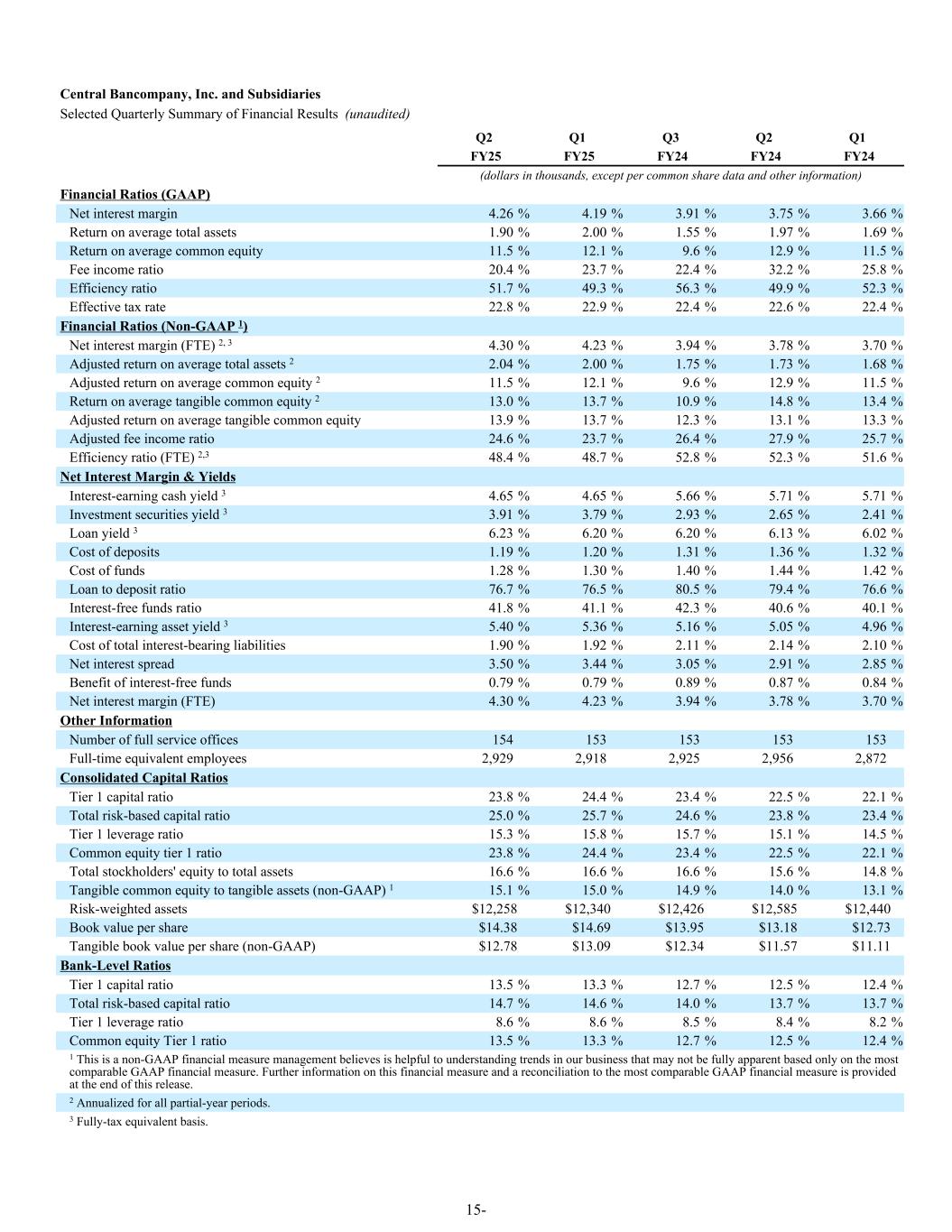 Financial Ratios (GAAP) Net interest margin 4.26 % 4.19 % 3.91 % 3.75 % 3.66 % Return on average total assets 1.90 % 2.00 % 1.55 % 1.97 % 1.69 % Return on average common equity 11.5 % 12.1 % 9.6 % 12.9 % 11.5 % Fee income ratio 20.4 % 23.7 % 22.4 % 32.2 % 25.8 % Efficiency ratio 51.7 % 49.3 % 56.3 % 49.9 % 52.3 % Effective tax rate 22.8 % 22.9 % 22.4 % 22.6 % 22.4 % Financial Ratios (Non-GAAP 1) Net interest margin (FTE) 2, 3 4.30 % 4.23 % 3.94 % 3.78 % 3.70 % Adjusted return on average total assets 2 2.04 % 2.00 % 1.75 % 1.73 % 1.68 % Adjusted return on average common equity 2 11.5 % 12.1 % 9.6 % 12.9 % 11.5 % Return on average tangible common equity 2 13.0 % 13.7 % 10.9 % 14.8 % 13.4 % Adjusted return on average tangible common equity 13.9 % 13.7 % 12.3 % 13.1 % 13.3 % Adjusted fee income ratio 24.6 % 23.7 % 26.4 % 27.9 % 25.7 % Efficiency ratio (FTE) 2,3 48.4 % 48.7 % 52.8 % 52.3 % 51.6 % Net Interest Margin & Yields Interest-earning cash yield 3 4.65 % 4.65 % 5.66 % 5.71 % 5.71 % Investment securities yield 3 3.91 % 3.79 % 2.93 % 2.65 % 2.41 % Loan yield 3 6.23 % 6.20 % 6.20 % 6.13 % 6.02 % Cost of deposits 1.19 % 1.20 % 1.31 % 1.36 % 1.32 % Cost of funds 1.28 % 1.30 % 1.40 % 1.44 % 1.42 % Loan to deposit ratio 76.7 % 76.5 % 80.5 % 79.4 % 76.6 % Interest-free funds ratio 41.8 % 41.1 % 42.3 % 40.6 % 40.1 % Interest-earning asset yield 3 5.40 % 5.36 % 5.16 % 5.05 % 4.96 % Cost of total interest-bearing liabilities 1.90 % 1.92 % 2.11 % 2.14 % 2.10 % Net interest spread 3.50 % 3.44 % 3.05 % 2.91 % 2.85 % Benefit of interest-free funds 0.79 % 0.79 % 0.89 % 0.87 % 0.84 % Net interest margin (FTE) 4.30 % 4.23 % 3.94 % 3.78 % 3.70 % Other Information Number of full service offices 154 153 153 153 153 Full-time equivalent employees 2,929 2,918 2,925 2,956 2,872 Consolidated Capital Ratios Tier 1 capital ratio 23.8 % 24.4 % 23.4 % 22.5 % 22.1 % Total risk-based capital ratio 25.0 % 25.7 % 24.6 % 23.8 % 23.4 % Tier 1 leverage ratio 15.3 % 15.8 % 15.7 % 15.1 % 14.5 % Common equity tier 1 ratio 23.8 % 24.4 % 23.4 % 22.5 % 22.1 % Total stockholders' equity to total assets 16.6 % 16.6 % 16.6 % 15.6 % 14.8 % Tangible common equity to tangible assets (non-GAAP) 1 15.1 % 15.0 % 14.9 % 14.0 % 13.1 % Risk-weighted assets $12,258 $12,340 $12,426 $12,585 $12,440 Book value per share $14.38 $14.69 $13.95 $13.18 $12.73 Tangible book value per share (non-GAAP) $12.78 $13.09 $12.34 $11.57 $11.11 Bank-Level Ratios Tier 1 capital ratio 13.5 % 13.3 % 12.7 % 12.5 % 12.4 % Total risk-based capital ratio 14.7 % 14.6 % 14.0 % 13.7 % 13.7 % Tier 1 leverage ratio 8.6 % 8.6 % 8.5 % 8.4 % 8.2 % Common equity Tier 1 ratio 13.5 % 13.3 % 12.7 % 12.5 % 12.4 % 1 This is a non-GAAP financial measure management believes is helpful to understanding trends in our business that may not be fully apparent based only on the most comparable GAAP financial measure. Further information on this financial measure and a reconciliation to the most comparable GAAP financial measure is provided at the end of this release. 2 Annualized for all partial-year periods. 3 Fully-tax equivalent basis. Central Bancompany, Inc. and Subsidiaries Selected Quarterly Summary of Financial Results (unaudited) Q2 Q1 Q3 Q2 Q1 FY25 FY25 FY24 FY24 FY24 (dollars in thousands, except per common share data and other information) 15-