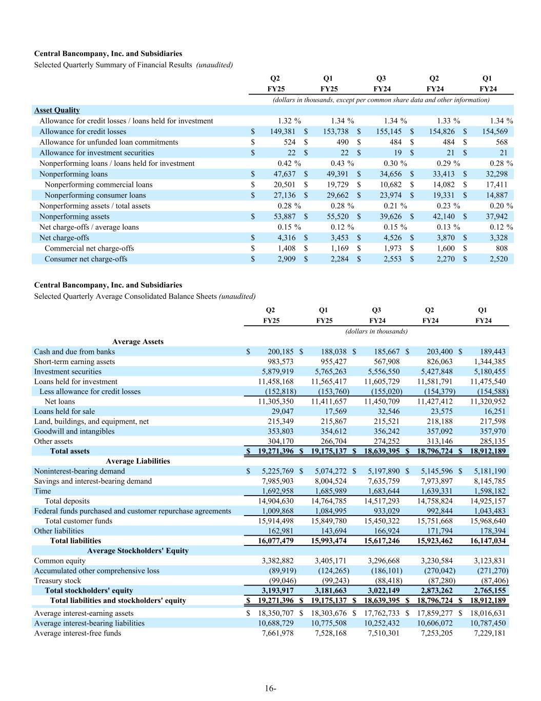 Asset Quality Allowance for credit losses / loans held for investment 1.32 % 1.34 % 1.34 % 1.33 % 1.34 % Allowance for credit losses $ 149,381 $ 153,738 $ 155,145 $ 154,826 $ 154,569 Allowance for unfunded loan commitments $ 524 $ 490 $ 484 $ 484 $ 568 Allowance for investment securities $ 22 $ 22 $ 19 $ 21 $ 21 Nonperforming loans / loans held for investment 0.42 % 0.43 % 0.30 % 0.29 % 0.28 % Nonperforming loans $ 47,637 $ 49,391 $ 34,656 $ 33,413 $ 32,298 Nonperforming commercial loans $ 20,501 $ 19,729 $ 10,682 $ 14,082 $ 17,411 Nonperforming consumer loans $ 27,136 $ 29,662 $ 23,974 $ 19,331 $ 14,887 Nonperforming assets / total assets 0.28 % 0.28 % 0.21 % 0.23 % 0.20 % Nonperforming assets $ 53,887 $ 55,520 $ 39,626 $ 42,140 $ 37,942 Net charge-offs / average loans 0.15 % 0.12 % 0.15 % 0.13 % 0.12 % Net charge-offs $ 4,316 $ 3,453 $ 4,526 $ 3,870 $ 3,328 Commercial net charge-offs $ 1,408 $ 1,169 $ 1,973 $ 1,600 $ 808 Consumer net charge-offs $ 2,909 $ 2,284 $ 2,553 $ 2,270 $ 2,520 Central Bancompany, Inc. and Subsidiaries Selected Quarterly Summary of Financial Results (unaudited) Q2 Q1 Q3 Q2 Q1 FY25 FY25 FY24 FY24 FY24 (dollars in thousands, except per common share data and other information) Central Bancompany, Inc. and Subsidiaries Selected Quarterly Average Consolidated Balance Sheets (unaudited) Q2 Q1 Q3 Q2 Q1 FY25 FY25 FY24 FY24 FY24 (dollars in thousands) Average Assets Cash and due from banks $ 200,185 $ 188,038 $ 185,667 $ 203,400 $ 189,443 Short-term earning assets 983,573 955,427 567,908 826,063 1,344,385 Investment securities 5,879,919 5,765,263 5,556,550 5,427,848 5,180,455 Loans held for investment 11,458,168 11,565,417 11,605,729 11,581,791 11,475,540 Less allowance for credit losses (152,818) (153,760) (155,020) (154,379) (154,588) Net loans 11,305,350 11,411,657 11,450,709 11,427,412 11,320,952 Loans held for sale 29,047 17,569 32,546 23,575 16,251 Land, buildings, and equipment, net 215,349 215,867 215,521 218,188 217,598 Goodwill and intangibles 353,803 354,612 356,242 357,092 357,970 Other assets 304,170 266,704 274,252 313,146 285,135 Total assets $ 19,271,396 $ 19,175,137 $ 18,639,395 $ 18,796,724 $ 18,912,189 Average Liabilities Noninterest-bearing demand $ 5,225,769 $ 5,074,272 $ 5,197,890 $ 5,145,596 $ 5,181,190 Savings and interest-bearing demand 7,985,903 8,004,524 7,635,759 7,973,897 8,145,785 Time 1,692,958 1,685,989 1,683,644 1,639,331 1,598,182 Total deposits 14,904,630 14,764,785 14,517,293 14,758,824 14,925,157 Federal funds purchased and customer repurchase agreements 1,009,868 1,084,995 933,029 992,844 1,043,483 Total customer funds 15,914,498 15,849,780 15,450,322 15,751,668 15,968,640 Other liabilities 162,981 143,694 166,924 171,794 178,394 Total liabilities 16,077,479 15,993,474 15,617,246 15,923,462 16,147,034 Average Stockholders' Equity Common equity 3,382,882 3,405,171 3,296,668 3,230,584 3,123,831 Accumulated other comprehensive loss (89,919) (124,265) (186,101) (270,042) (271,270) Treasury stock (99,046) (99,243) (88,418) (87,280) (87,406) Total stockholders' equity 3,193,917 3,181,663 3,022,149 2,873,262 2,765,155 Total liabilities and stockholders' equity $ 19,271,396 $ 19,175,137 $ 18,639,395 $ 18,796,724 $ 18,912,189 Average interest-earning assets $ 18,350,707 $ 18,303,676 $ 17,762,733 $ 17,859,277 $ 18,016,631 Average interest-bearing liabilities 10,688,729 10,775,508 10,252,432 10,606,072 10,787,450 Average interest-free funds 7,661,978 7,528,168 7,510,301 7,253,205 7,229,181 16-