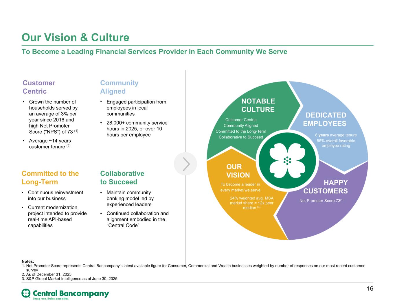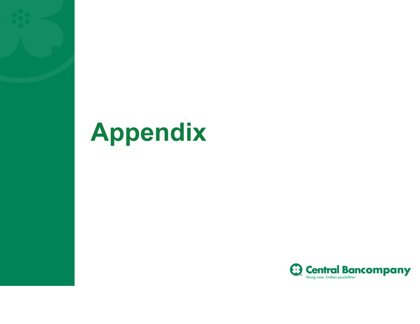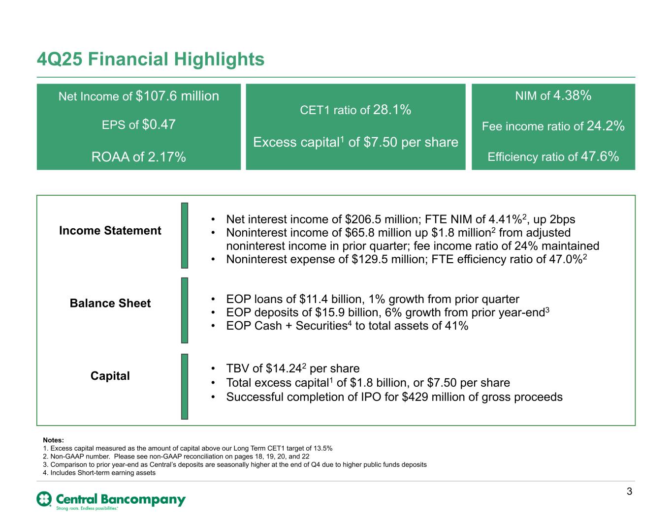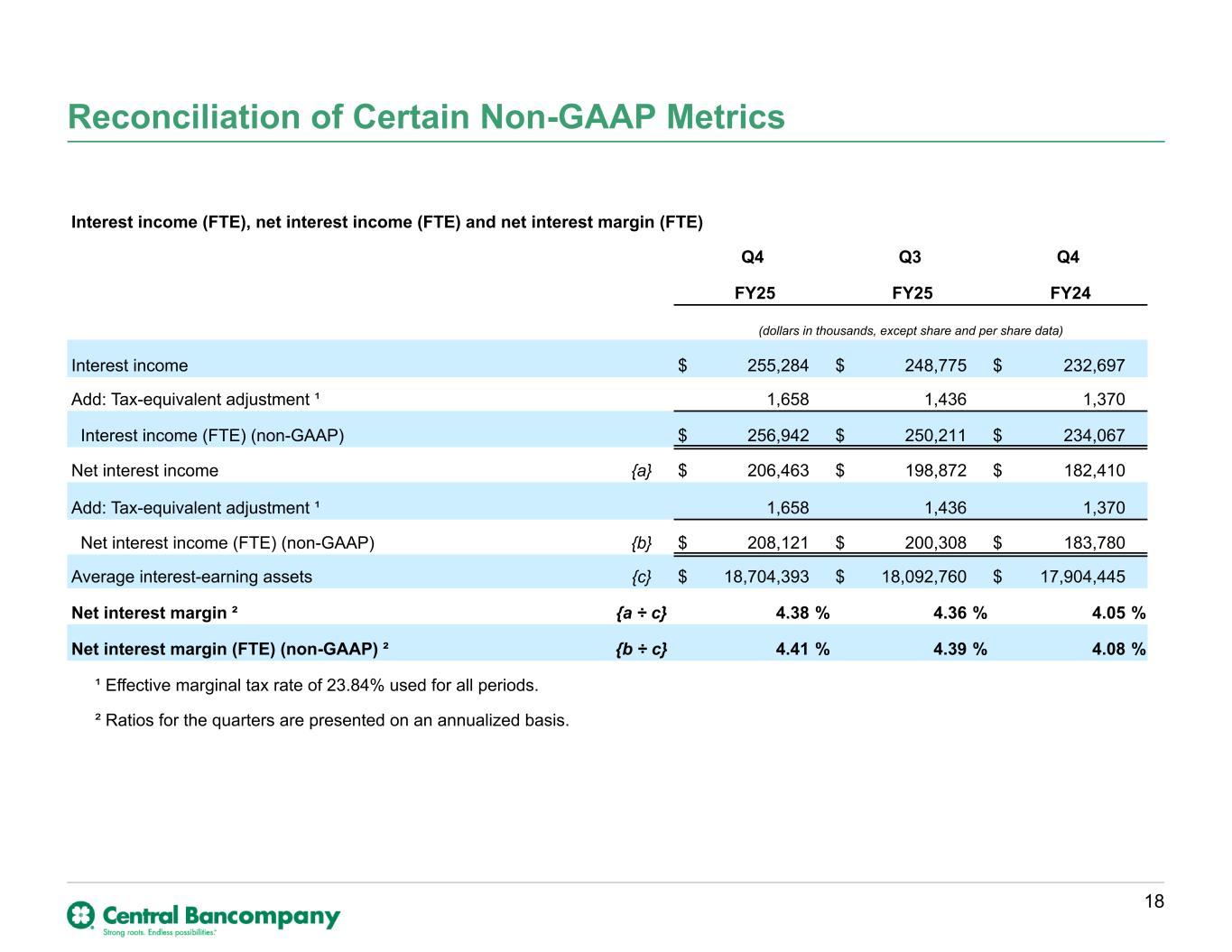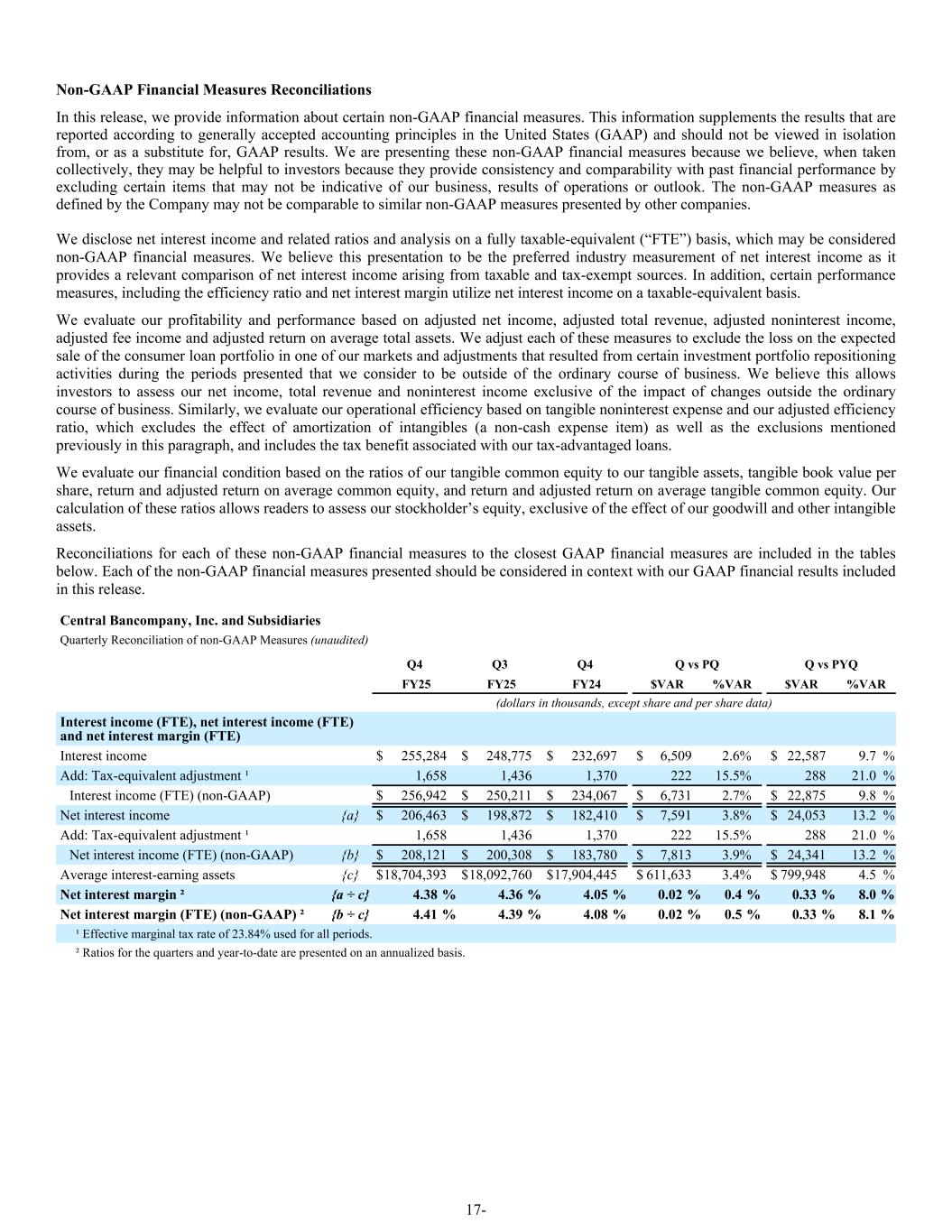 Non-GAAP Financial Measures Reconciliations In this release, we provide information about certain non-GAAP financial measures. This information supplements the results that are reported according to generally accepted accounting principles in the United States (GAAP) and should not be viewed in isolation from, or as a substitute for, GAAP results. We are presenting these non-GAAP financial measures because we believe, when taken collectively, they may be helpful to investors because they provide consistency and comparability with past financial performance by excluding certain items that may not be indicative of our business, results of operations or outlook. The non-GAAP measures as defined by the Company may not be comparable to similar non-GAAP measures presented by other companies. We disclose net interest income and related ratios and analysis on a fully taxable-equivalent (“FTE”) basis, which may be considered non-GAAP financial measures. We believe this presentation to be the preferred industry measurement of net interest income as it provides a relevant comparison of net interest income arising from taxable and tax-exempt sources. In addition, certain performance measures, including the efficiency ratio and net interest margin utilize net interest income on a taxable-equivalent basis. We evaluate our profitability and performance based on adjusted net income, adjusted total revenue, adjusted noninterest income, adjusted fee income and adjusted return on average total assets. We adjust each of these measures to exclude the loss on the expected sale of the consumer loan portfolio in one of our markets and adjustments that resulted from certain investment portfolio repositioning activities during the periods presented that we consider to be outside of the ordinary course of business. We believe this allows investors to assess our net income, total revenue and noninterest income exclusive of the impact of changes outside the ordinary course of business. Similarly, we evaluate our operational efficiency based on tangible noninterest expense and our adjusted efficiency ratio, which excludes the effect of amortization of intangibles (a non-cash expense item) as well as the exclusions mentioned previously in this paragraph, and includes the tax benefit associated with our tax-advantaged loans. We evaluate our financial condition based on the ratios of our tangible common equity to our tangible assets, tangible book value per share, return and adjusted return on average common equity, and return and adjusted return on average tangible common equity. Our calculation of these ratios allows readers to assess our stockholder’s equity, exclusive of the effect of our goodwill and other intangible assets. Reconciliations for each of these non-GAAP financial measures to the closest GAAP financial measures are included in the tables below. Each of the non-GAAP financial measures presented should be considered in context with our GAAP financial results included in this release. Interest income (FTE), net interest income (FTE) and net interest margin (FTE) Interest income $ 255,284 $ 248,775 $ 232,697 $ 6,509 2.6 % $ 22,587 9.7 % Add: Tax-equivalent adjustment ¹ 1,658 1,436 1,370 222 15.5 % 288 21.0 % Interest income (FTE) (non-GAAP) $ 256,942 $ 250,211 $ 234,067 $ 6,731 2.7 % $ 22,875 9.8 % Net interest income {a} $ 206,463 $ 198,872 $ 182,410 $ 7,591 3.8 % $ 24,053 13.2 % Add: Tax-equivalent adjustment ¹ 1,658 1,436 1,370 222 15.5 % 288 21.0 % Net interest income (FTE) (non-GAAP) {b} $ 208,121 $ 200,308 $ 183,780 $ 7,813 3.9 % $ 24,341 13.2 % Average interest-earning assets {c} $ 18,704,393 $ 18,092,760 $ 17,904,445 $ 611,633 3.4 % $ 799,948 4.5 % Net interest margin ² {a ÷ c} 4.38 % 4.36 % 4.05 % 0.02 % 0.4 % 0.33 % 8.0 % Net interest margin (FTE) (non-GAAP) ² {b ÷ c} 4.41 % 4.39 % 4.08 % 0.02 % 0.5 % 0.33 % 8.1 % ¹ Effective marginal tax rate of 23.84% used for all periods. ² Ratios for the quarters and year-to-date are presented on an annualized basis. Central Bancompany, Inc. and Subsidiaries Quarterly Reconciliation of non-GAAP Measures (unaudited) Q4 Q3 Q4 Q vs PQ Q vs PYQ FY25 FY25 FY24 $VAR %VAR $VAR %VAR (dollars in thousands, except share and per share data) 17-