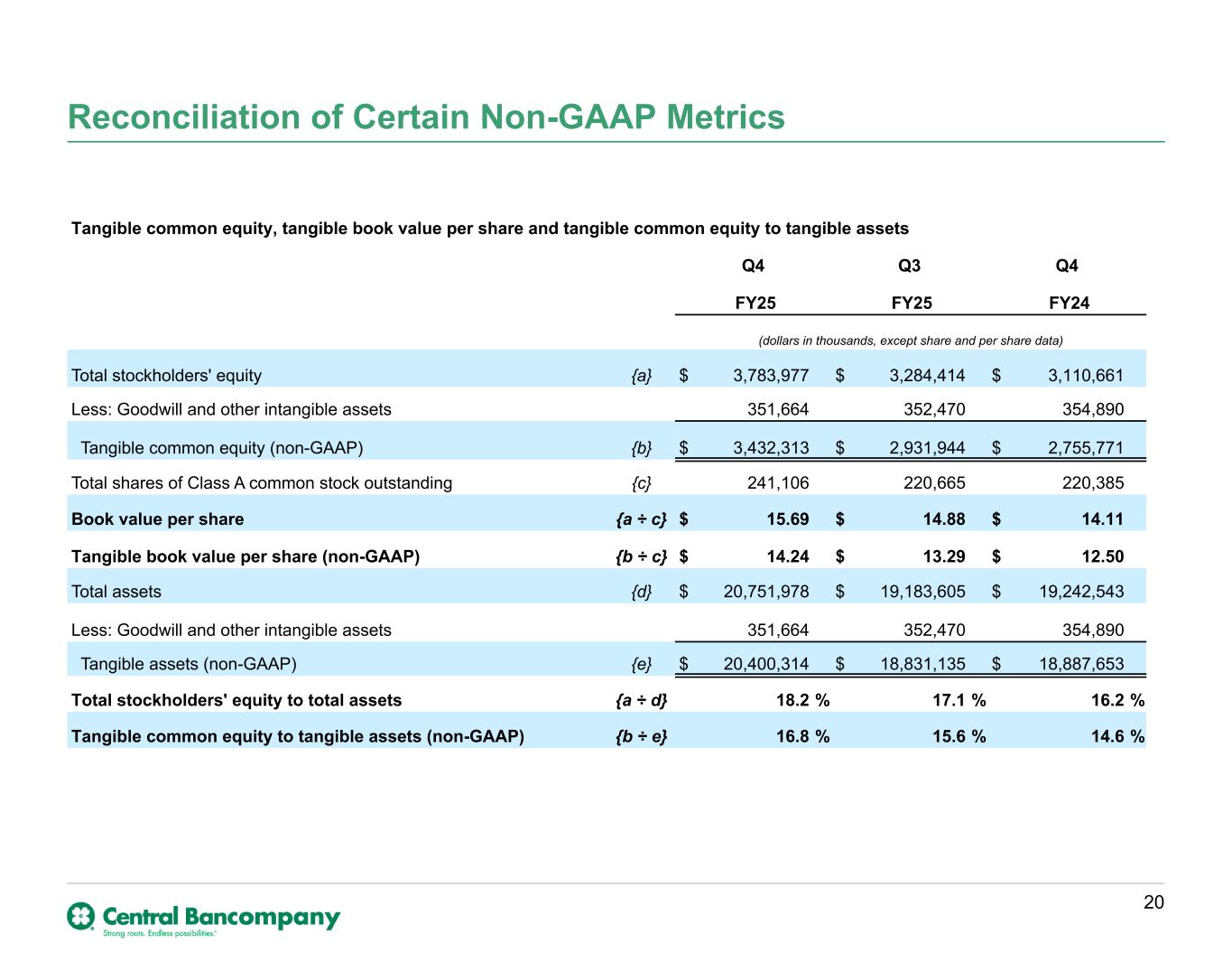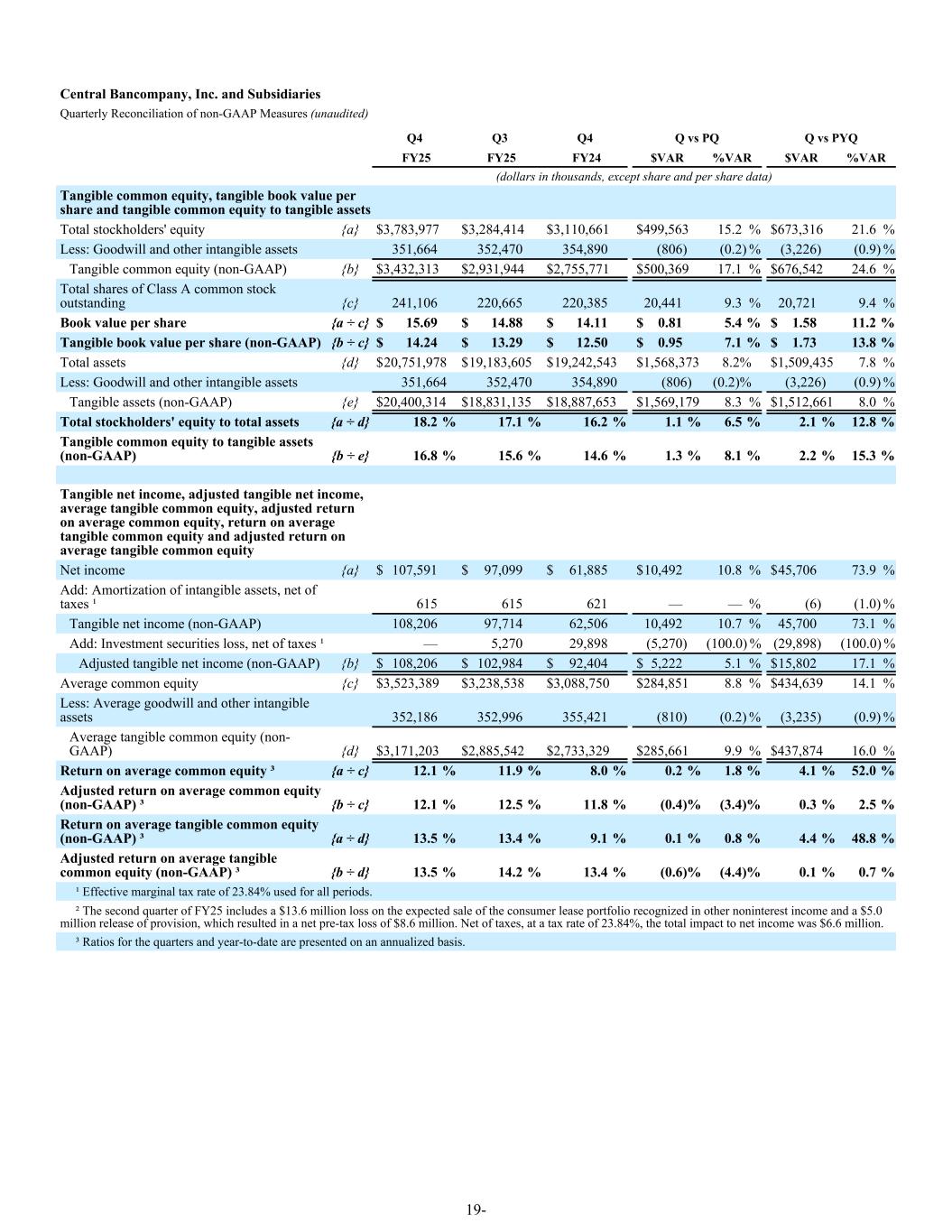 Tangible common equity, tangible book value per share and tangible common equity to tangible assets Total stockholders' equity {a} $ 3,783,977 $ 3,284,414 $ 3,110,661 $ 499,563 15.2 % $ 673,316 21.6 % Less: Goodwill and other intangible assets 351,664 352,470 354,890 (806) (0.2) % (3,226) (0.9) % Tangible common equity (non-GAAP) {b} $ 3,432,313 $ 2,931,944 $ 2,755,771 $ 500,369 17.1 % $ 676,542 24.6 % Total shares of Class A common stock outstanding {c} 241,106 220,665 220,385 20,441 9.3 % 20,721 9.4 % Book value per share {a ÷ c} $ 15.69 $ 14.88 $ 14.11 $ 0.81 5.4 % $ 1.58 11.2 % Tangible book value per share (non-GAAP) {b ÷ c} $ 14.24 $ 13.29 $ 12.50 $ 0.95 7.1 % $ 1.73 13.8 % Total assets {d} $ 20,751,978 $ 19,183,605 $ 19,242,543 $ 1,568,373 8.2 % $ 1,509,435 7.8 % Less: Goodwill and other intangible assets 351,664 352,470 354,890 (806) (0.2) % (3,226) (0.9) % Tangible assets (non-GAAP) {e} $ 20,400,314 $ 18,831,135 $ 18,887,653 $ 1,569,179 8.3 % $ 1,512,661 8.0 % Total stockholders' equity to total assets {a ÷ d} 18.2 % 17.1 % 16.2 % 1.1 % 6.5 % 2.1 % 12.8 % Tangible common equity to tangible assets (non-GAAP) {b ÷ e} 16.8 % 15.6 % 14.6 % 1.3 % 8.1 % 2.2 % 15.3 % Tangible net income, adjusted tangible net income, average tangible common equity, adjusted return on average common equity, return on average tangible common equity and adjusted return on average tangible common equity Net income {a} $ 107,591 $ 97,099 $ 61,885 $ 10,492 10.8 % $ 45,706 73.9 % Add: Amortization of intangible assets, net of taxes ¹ 615 615 621 — — % (6) (1.0) % Tangible net income (non-GAAP) 108,206 97,714 62,506 10,492 10.7 % 45,700 73.1 % Add: Investment securities loss, net of taxes ¹ — 5,270 29,898 (5,270) (100.0) % (29,898) (100.0) % Adjusted tangible net income (non-GAAP) {b} $ 108,206 $ 102,984 $ 92,404 $ 5,222 5.1 % $ 15,802 17.1 % Average common equity {c} $ 3,523,389 $ 3,238,538 $ 3,088,750 $ 284,851 8.8 % $ 434,639 14.1 % Less: Average goodwill and other intangible assets 352,186 352,996 355,421 (810) (0.2) % (3,235) (0.9) % Average tangible common equity (non- GAAP) {d} $ 3,171,203 $ 2,885,542 $ 2,733,329 $ 285,661 9.9 % $ 437,874 16.0 % Return on average common equity ³ {a ÷ c} 12.1 % 11.9 % 8.0 % 0.2 % 1.8 % 4.1 % 52.0 % Adjusted return on average common equity (non-GAAP) ³ {b ÷ c} 12.1 % 12.5 % 11.8 % (0.4) % (3.4) % 0.3 % 2.5 % Return on average tangible common equity (non-GAAP) ³ {a ÷ d} 13.5 % 13.4 % 9.1 % 0.1 % 0.8 % 4.4 % 48.8 % Adjusted return on average tangible common equity (non-GAAP) ³ {b ÷ d} 13.5 % 14.2 % 13.4 % (0.6) % (4.4) % 0.1 % 0.7 % ¹ Effective marginal tax rate of 23.84% used for all periods. ² The second quarter of FY25 includes a $13.6 million loss on the expected sale of the consumer lease portfolio recognized in other noninterest income and a $5.0 million release of provision, which resulted in a net pre-tax loss of $8.6 million. Net of taxes, at a tax rate of 23.84%, the total impact to net income was $6.6 million. ³ Ratios for the quarters and year-to-date are presented on an annualized basis. Central Bancompany, Inc. and Subsidiaries Quarterly Reconciliation of non-GAAP Measures (unaudited) Q4 Q3 Q4 Q vs PQ Q vs PYQ FY25 FY25 FY24 $VAR %VAR $VAR %VAR (dollars in thousands, except share and per share data) 19-