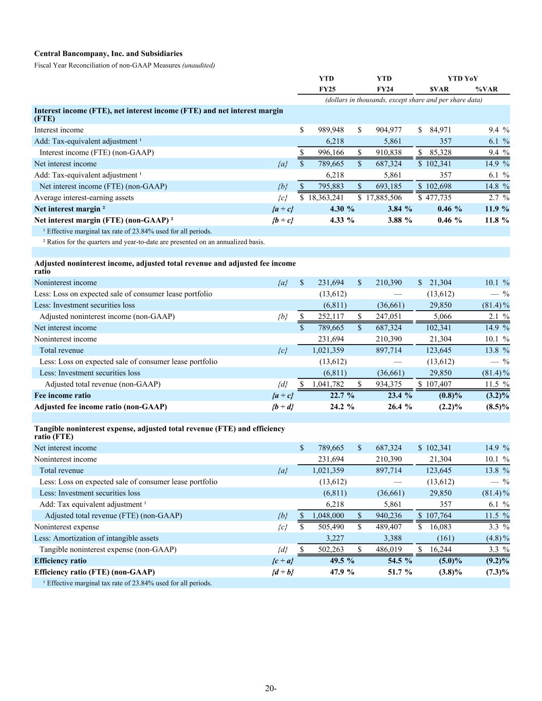 Interest income (FTE), net interest income (FTE) and net interest margin (FTE) Interest income $ 989,948 $ 904,977 $ 84,971 9.4 % Add: Tax-equivalent adjustment ¹ 6,218 5,861 357 6.1 % Interest income (FTE) (non-GAAP) $ 996,166 $ 910,838 $ 85,328 9.4 % Net interest income {a} $ 789,665 $ 687,324 $ 102,341 14.9 % Add: Tax-equivalent adjustment ¹ 6,218 5,861 357 6.1 % Net interest income (FTE) (non-GAAP) {b} $ 795,883 $ 693,185 $ 102,698 14.8 % Average interest-earning assets {c} $ 18,363,241 $ 17,885,506 $ 477,735 2.7 % Net interest margin ² {a ÷ c} 4.30 % 3.84 % 0.46 % 11.9 % Net interest margin (FTE) (non-GAAP) ² {b ÷ c} 4.33 % 3.88 % 0.46 % 11.8 % ¹ Effective marginal tax rate of 23.84% used for all periods. ² Ratios for the quarters and year-to-date are presented on an annualized basis. Adjusted noninterest income, adjusted total revenue and adjusted fee income ratio Noninterest income {a} $ 231,694 $ 210,390 $ 21,304 10.1 % Less: Loss on expected sale of consumer lease portfolio (13,612) — (13,612) — % Less: Investment securities loss (6,811) (36,661) 29,850 (81.4) % Adjusted noninterest income (non-GAAP) {b} $ 252,117 $ 247,051 5,066 2.1 % Net interest income $ 789,665 $ 687,324 102,341 14.9 % Noninterest income 231,694 210,390 21,304 10.1 % Total revenue {c} 1,021,359 897,714 123,645 13.8 % Less: Loss on expected sale of consumer lease portfolio (13,612) — (13,612) — % Less: Investment securities loss (6,811) (36,661) 29,850 (81.4) % Adjusted total revenue (non-GAAP) {d} $ 1,041,782 $ 934,375 $ 107,407 11.5 % Fee income ratio {a ÷ c} 22.7 % 23.4 % (0.8) % (3.2) % Adjusted fee income ratio (non-GAAP) {b ÷ d} 24.2 % 26.4 % (2.2) % (8.5) % Tangible noninterest expense, adjusted total revenue (FTE) and efficiency ratio (FTE) Net interest income $ 789,665 $ 687,324 $ 102,341 14.9 % Noninterest income 231,694 210,390 21,304 10.1 % Total revenue {a} 1,021,359 897,714 123,645 13.8 % Less: Loss on expected sale of consumer lease portfolio (13,612) — (13,612) — % Less: Investment securities loss (6,811) (36,661) 29,850 (81.4) % Add: Tax equivalent adjustment ¹ 6,218 5,861 357 6.1 % Adjusted total revenue (FTE) (non-GAAP) {b} $ 1,048,000 $ 940,236 $ 107,764 11.5 % Noninterest expense {c} $ 505,490 $ 489,407 $ 16,083 3.3 % Less: Amortization of intangible assets 3,227 3,388 (161) (4.8) % Tangible noninterest expense (non-GAAP) {d} $ 502,263 $ 486,019 $ 16,244 3.3 % Efficiency ratio {c ÷ a} 49.5 % 54.5 % (5.0) % (9.2) % Efficiency ratio (FTE) (non-GAAP) {d ÷ b} 47.9 % 51.7 % (3.8) % (7.3) % ¹ Effective marginal tax rate of 23.84% used for all periods. Central Bancompany, Inc. and Subsidiaries Fiscal Year Reconciliation of non-GAAP Measures (unaudited) YTD YTD YTD YoY FY25 FY24 $VAR %VAR (dollars in thousands, except share and per share data) 20-