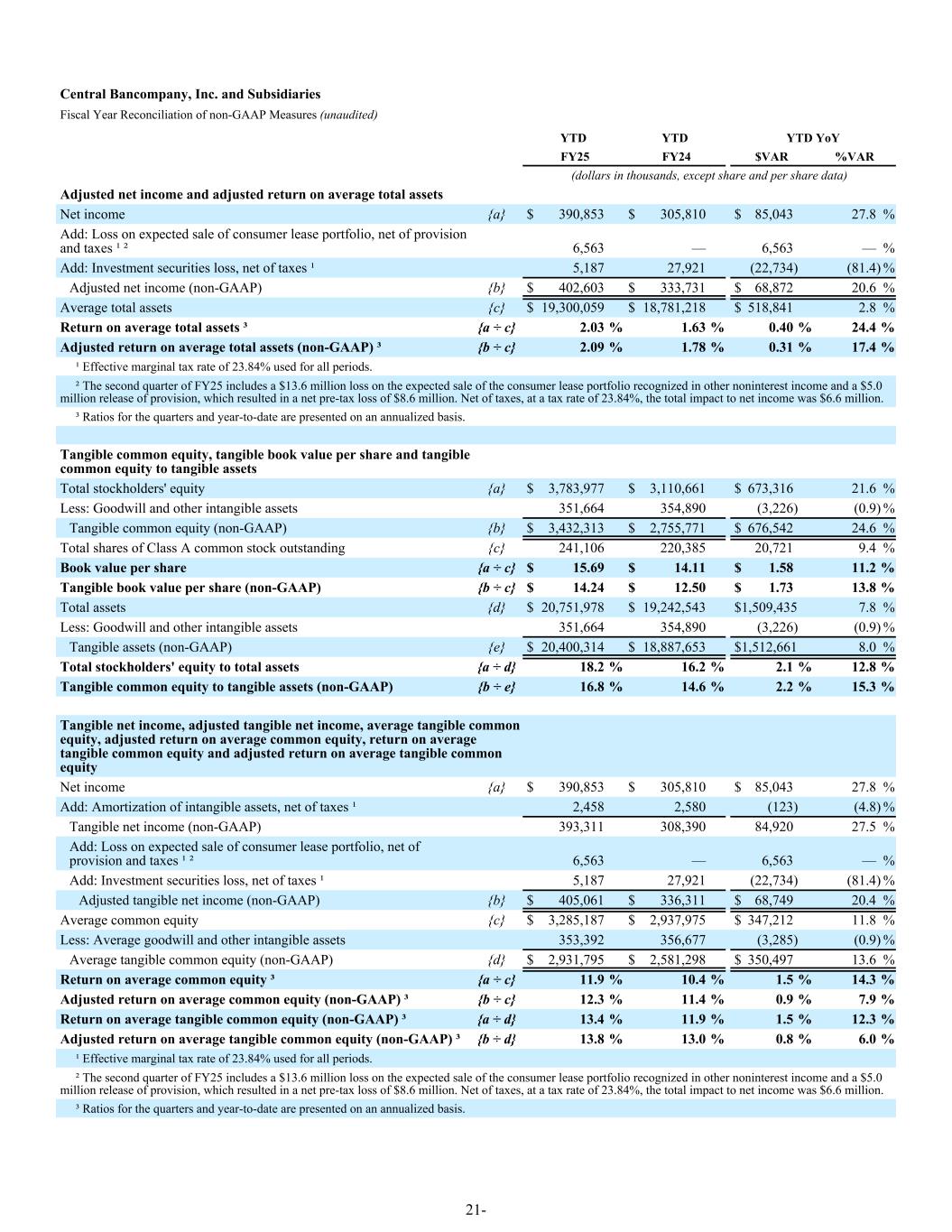 Adjusted net income and adjusted return on average total assets Net income {a} $ 390,853 $ 305,810 $ 85,043 27.8 % Add: Loss on expected sale of consumer lease portfolio, net of provision and taxes ¹ ² 6,563 — 6,563 — % Add: Investment securities loss, net of taxes ¹ 5,187 27,921 (22,734) (81.4) % Adjusted net income (non-GAAP) {b} $ 402,603 $ 333,731 $ 68,872 20.6 % Average total assets {c} $ 19,300,059 $ 18,781,218 $ 518,841 2.8 % Return on average total assets ³ {a ÷ c} 2.03 % 1.63 % 0.40 % 24.4 % Adjusted return on average total assets (non-GAAP) ³ {b ÷ c} 2.09 % 1.78 % 0.31 % 17.4 % ¹ Effective marginal tax rate of 23.84% used for all periods. ² The second quarter of FY25 includes a $13.6 million loss on the expected sale of the consumer lease portfolio recognized in other noninterest income and a $5.0 million release of provision, which resulted in a net pre-tax loss of $8.6 million. Net of taxes, at a tax rate of 23.84%, the total impact to net income was $6.6 million. ³ Ratios for the quarters and year-to-date are presented on an annualized basis. Tangible common equity, tangible book value per share and tangible common equity to tangible assets Total stockholders' equity {a} $ 3,783,977 $ 3,110,661 $ 673,316 21.6 % Less: Goodwill and other intangible assets 351,664 354,890 (3,226) (0.9) % Tangible common equity (non-GAAP) {b} $ 3,432,313 $ 2,755,771 $ 676,542 24.6 % Total shares of Class A common stock outstanding {c} 241,106 220,385 20,721 9.4 % Book value per share {a ÷ c} $ 15.69 $ 14.11 $ 1.58 11.2 % Tangible book value per share (non-GAAP) {b ÷ c} $ 14.24 $ 12.50 $ 1.73 13.8 % Total assets {d} $ 20,751,978 $ 19,242,543 $ 1,509,435 7.8 % Less: Goodwill and other intangible assets 351,664 354,890 (3,226) (0.9) % Tangible assets (non-GAAP) {e} $ 20,400,314 $ 18,887,653 $ 1,512,661 8.0 % Total stockholders' equity to total assets {a ÷ d} 18.2 % 16.2 % 2.1 % 12.8 % Tangible common equity to tangible assets (non-GAAP) {b ÷ e} 16.8 % 14.6 % 2.2 % 15.3 % Tangible net income, adjusted tangible net income, average tangible common equity, adjusted return on average common equity, return on average tangible common equity and adjusted return on average tangible common equity Net income {a} $ 390,853 $ 305,810 $ 85,043 27.8 % Add: Amortization of intangible assets, net of taxes ¹ 2,458 2,580 (123) (4.8) % Tangible net income (non-GAAP) 393,311 308,390 84,920 27.5 % Add: Loss on expected sale of consumer lease portfolio, net of provision and taxes ¹ ² 6,563 — 6,563 — % Add: Investment securities loss, net of taxes ¹ 5,187 27,921 (22,734) (81.4) % Adjusted tangible net income (non-GAAP) {b} $ 405,061 $ 336,311 $ 68,749 20.4 % Average common equity {c} $ 3,285,187 $ 2,937,975 $ 347,212 11.8 % Less: Average goodwill and other intangible assets 353,392 356,677 (3,285) (0.9) % Average tangible common equity (non-GAAP) {d} $ 2,931,795 $ 2,581,298 $ 350,497 13.6 % Return on average common equity ³ {a ÷ c} 11.9 % 10.4 % 1.5 % 14.3 % Adjusted return on average common equity (non-GAAP) ³ {b ÷ c} 12.3 % 11.4 % 0.9 % 7.9 % Return on average tangible common equity (non-GAAP) ³ {a ÷ d} 13.4 % 11.9 % 1.5 % 12.3 % Adjusted return on average tangible common equity (non-GAAP) ³ {b ÷ d} 13.8 % 13.0 % 0.8 % 6.0 % ¹ Effective marginal tax rate of 23.84% used for all periods. ² The second quarter of FY25 includes a $13.6 million loss on the expected sale of the consumer lease portfolio recognized in other noninterest income and a $5.0 million release of provision, which resulted in a net pre-tax loss of $8.6 million. Net of taxes, at a tax rate of 23.84%, the total impact to net income was $6.6 million. ³ Ratios for the quarters and year-to-date are presented on an annualized basis. Central Bancompany, Inc. and Subsidiaries Fiscal Year Reconciliation of non-GAAP Measures (unaudited) YTD YTD YTD YoY FY25 FY24 $VAR %VAR (dollars in thousands, except share and per share data) 21-
