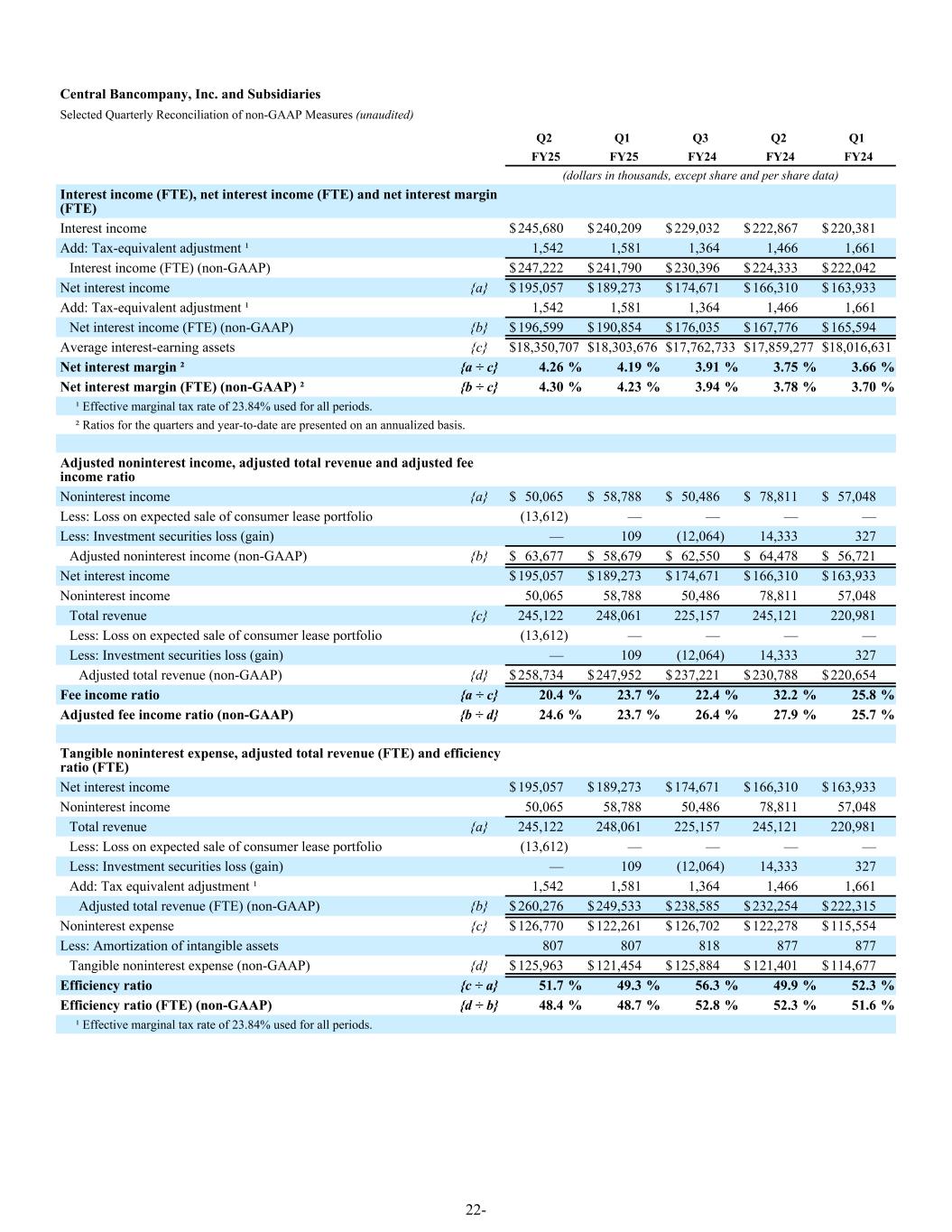 Interest income (FTE), net interest income (FTE) and net interest margin (FTE) Interest income $ 245,680 $ 240,209 $ 229,032 $ 222,867 $ 220,381 Add: Tax-equivalent adjustment ¹ 1,542 1,581 1,364 1,466 1,661 Interest income (FTE) (non-GAAP) $ 247,222 $ 241,790 $ 230,396 $ 224,333 $ 222,042 Net interest income {a} $ 195,057 $ 189,273 $ 174,671 $ 166,310 $ 163,933 Add: Tax-equivalent adjustment ¹ 1,542 1,581 1,364 1,466 1,661 Net interest income (FTE) (non-GAAP) {b} $ 196,599 $ 190,854 $ 176,035 $ 167,776 $ 165,594 Average interest-earning assets {c} $ 18,350,707 $ 18,303,676 $ 17,762,733 $ 17,859,277 $ 18,016,631 Net interest margin ² {a ÷ c} 4.26 % 4.19 % 3.91 % 3.75 % 3.66 % Net interest margin (FTE) (non-GAAP) ² {b ÷ c} 4.30 % 4.23 % 3.94 % 3.78 % 3.70 % ¹ Effective marginal tax rate of 23.84% used for all periods. ² Ratios for the quarters and year-to-date are presented on an annualized basis. Adjusted noninterest income, adjusted total revenue and adjusted fee income ratio Noninterest income {a} $ 50,065 $ 58,788 $ 50,486 $ 78,811 $ 57,048 Less: Loss on expected sale of consumer lease portfolio (13,612) — — — — Less: Investment securities loss (gain) — 109 (12,064) 14,333 327 Adjusted noninterest income (non-GAAP) {b} $ 63,677 $ 58,679 $ 62,550 $ 64,478 $ 56,721 Net interest income $ 195,057 $ 189,273 $ 174,671 $ 166,310 $ 163,933 Noninterest income 50,065 58,788 50,486 78,811 57,048 Total revenue {c} 245,122 248,061 225,157 245,121 220,981 Less: Loss on expected sale of consumer lease portfolio (13,612) — — — — Less: Investment securities loss (gain) — 109 (12,064) 14,333 327 Adjusted total revenue (non-GAAP) {d} $ 258,734 $ 247,952 $ 237,221 $ 230,788 $ 220,654 Fee income ratio {a ÷ c} 20.4 % 23.7 % 22.4 % 32.2 % 25.8 % Adjusted fee income ratio (non-GAAP) {b ÷ d} 24.6 % 23.7 % 26.4 % 27.9 % 25.7 % Tangible noninterest expense, adjusted total revenue (FTE) and efficiency ratio (FTE) Net interest income $ 195,057 $ 189,273 $ 174,671 $ 166,310 $ 163,933 Noninterest income 50,065 58,788 50,486 78,811 57,048 Total revenue {a} 245,122 248,061 225,157 245,121 220,981 Less: Loss on expected sale of consumer lease portfolio (13,612) — — — — Less: Investment securities loss (gain) — 109 (12,064) 14,333 327 Add: Tax equivalent adjustment ¹ 1,542 1,581 1,364 1,466 1,661 Adjusted total revenue (FTE) (non-GAAP) {b} $ 260,276 $ 249,533 $ 238,585 $ 232,254 $ 222,315 Noninterest expense {c} $ 126,770 $ 122,261 $ 126,702 $ 122,278 $ 115,554 Less: Amortization of intangible assets 807 807 818 877 877 Tangible noninterest expense (non-GAAP) {d} $ 125,963 $ 121,454 $ 125,884 $ 121,401 $ 114,677 Efficiency ratio {c ÷ a} 51.7 % 49.3 % 56.3 % 49.9 % 52.3 % Efficiency ratio (FTE) (non-GAAP) {d ÷ b} 48.4 % 48.7 % 52.8 % 52.3 % 51.6 % ¹ Effective marginal tax rate of 23.84% used for all periods. Central Bancompany, Inc. and Subsidiaries Selected Quarterly Reconciliation of non-GAAP Measures (unaudited) Q2 Q1 Q3 Q2 Q1 FY25 FY25 FY24 FY24 FY24 (dollars in thousands, except share and per share data) 22-