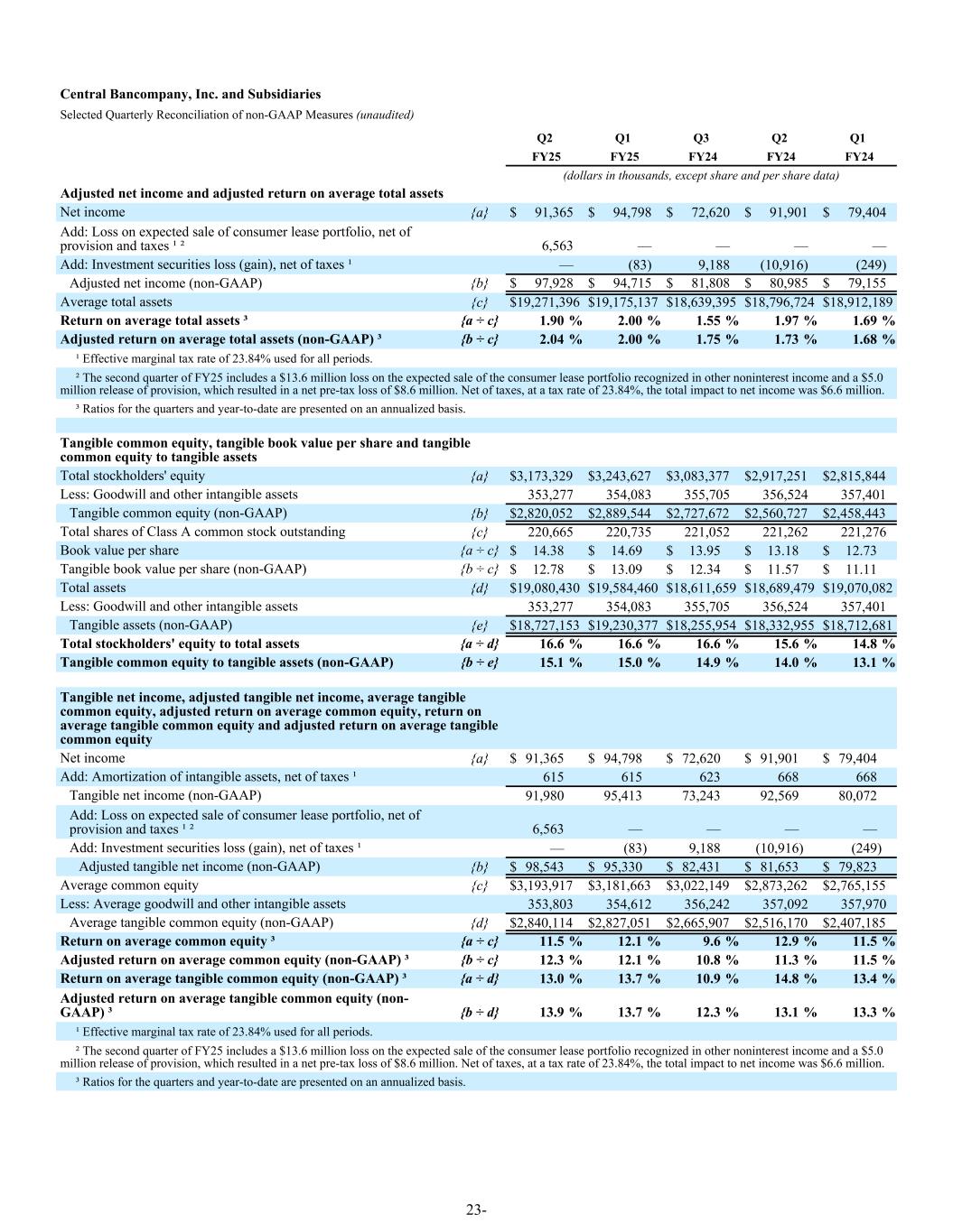 Adjusted net income and adjusted return on average total assets Net income {a} $ 91,365 $ 94,798 $ 72,620 $ 91,901 $ 79,404 Add: Loss on expected sale of consumer lease portfolio, net of provision and taxes ¹ ² 6,563 — — — — Add: Investment securities loss (gain), net of taxes ¹ — (83) 9,188 (10,916) (249) Adjusted net income (non-GAAP) {b} $ 97,928 $ 94,715 $ 81,808 $ 80,985 $ 79,155 Average total assets {c} $ 19,271,396 $ 19,175,137 $ 18,639,395 $ 18,796,724 $ 18,912,189 Return on average total assets ³ {a ÷ c} 1.90 % 2.00 % 1.55 % 1.97 % 1.69 % Adjusted return on average total assets (non-GAAP) ³ {b ÷ c} 2.04 % 2.00 % 1.75 % 1.73 % 1.68 % ¹ Effective marginal tax rate of 23.84% used for all periods. ² The second quarter of FY25 includes a $13.6 million loss on the expected sale of the consumer lease portfolio recognized in other noninterest income and a $5.0 million release of provision, which resulted in a net pre-tax loss of $8.6 million. Net of taxes, at a tax rate of 23.84%, the total impact to net income was $6.6 million. ³ Ratios for the quarters and year-to-date are presented on an annualized basis. Tangible common equity, tangible book value per share and tangible common equity to tangible assets Total stockholders' equity {a} $ 3,173,329 $ 3,243,627 $ 3,083,377 $ 2,917,251 $ 2,815,844 Less: Goodwill and other intangible assets 353,277 354,083 355,705 356,524 357,401 Tangible common equity (non-GAAP) {b} $ 2,820,052 $ 2,889,544 $ 2,727,672 $ 2,560,727 $ 2,458,443 Total shares of Class A common stock outstanding {c} 220,665 220,735 221,052 221,262 221,276 Book value per share {a ÷ c} $ 14.38 $ 14.69 $ 13.95 $ 13.18 $ 12.73 Tangible book value per share (non-GAAP) {b ÷ c} $ 12.78 $ 13.09 $ 12.34 $ 11.57 $ 11.11 Total assets {d} $ 19,080,430 $ 19,584,460 $ 18,611,659 $ 18,689,479 $ 19,070,082 Less: Goodwill and other intangible assets 353,277 354,083 355,705 356,524 357,401 Tangible assets (non-GAAP) {e} $ 18,727,153 $ 19,230,377 $ 18,255,954 $ 18,332,955 $ 18,712,681 Total stockholders' equity to total assets {a ÷ d} 16.6 % 16.6 % 16.6 % 15.6 % 14.8 % Tangible common equity to tangible assets (non-GAAP) {b ÷ e} 15.1 % 15.0 % 14.9 % 14.0 % 13.1 % Tangible net income, adjusted tangible net income, average tangible common equity, adjusted return on average common equity, return on average tangible common equity and adjusted return on average tangible common equity Net income {a} $ 91,365 $ 94,798 $ 72,620 $ 91,901 $ 79,404 Add: Amortization of intangible assets, net of taxes ¹ 615 615 623 668 668 Tangible net income (non-GAAP) 91,980 95,413 73,243 92,569 80,072 Add: Loss on expected sale of consumer lease portfolio, net of provision and taxes ¹ ² 6,563 — — — — Add: Investment securities loss (gain), net of taxes ¹ — (83) 9,188 (10,916) (249) Adjusted tangible net income (non-GAAP) {b} $ 98,543 $ 95,330 $ 82,431 $ 81,653 $ 79,823 Average common equity {c} $ 3,193,917 $ 3,181,663 $ 3,022,149 $ 2,873,262 $ 2,765,155 Less: Average goodwill and other intangible assets 353,803 354,612 356,242 357,092 357,970 Average tangible common equity (non-GAAP) {d} $ 2,840,114 $ 2,827,051 $ 2,665,907 $ 2,516,170 $ 2,407,185 Return on average common equity ³ {a ÷ c} 11.5 % 12.1 % 9.6 % 12.9 % 11.5 % Adjusted return on average common equity (non-GAAP) ³ {b ÷ c} 12.3 % 12.1 % 10.8 % 11.3 % 11.5 % Return on average tangible common equity (non-GAAP) ³ {a ÷ d} 13.0 % 13.7 % 10.9 % 14.8 % 13.4 % Adjusted return on average tangible common equity (non- GAAP) ³ {b ÷ d} 13.9 % 13.7 % 12.3 % 13.1 % 13.3 % ¹ Effective marginal tax rate of 23.84% used for all periods. ² The second quarter of FY25 includes a $13.6 million loss on the expected sale of the consumer lease portfolio recognized in other noninterest income and a $5.0 million release of provision, which resulted in a net pre-tax loss of $8.6 million. Net of taxes, at a tax rate of 23.84%, the total impact to net income was $6.6 million. ³ Ratios for the quarters and year-to-date are presented on an annualized basis. Central Bancompany, Inc. and Subsidiaries Selected Quarterly Reconciliation of non-GAAP Measures (unaudited) Q2 Q1 Q3 Q2 Q1 FY25 FY25 FY24 FY24 FY24 (dollars in thousands, except share and per share data) 23-