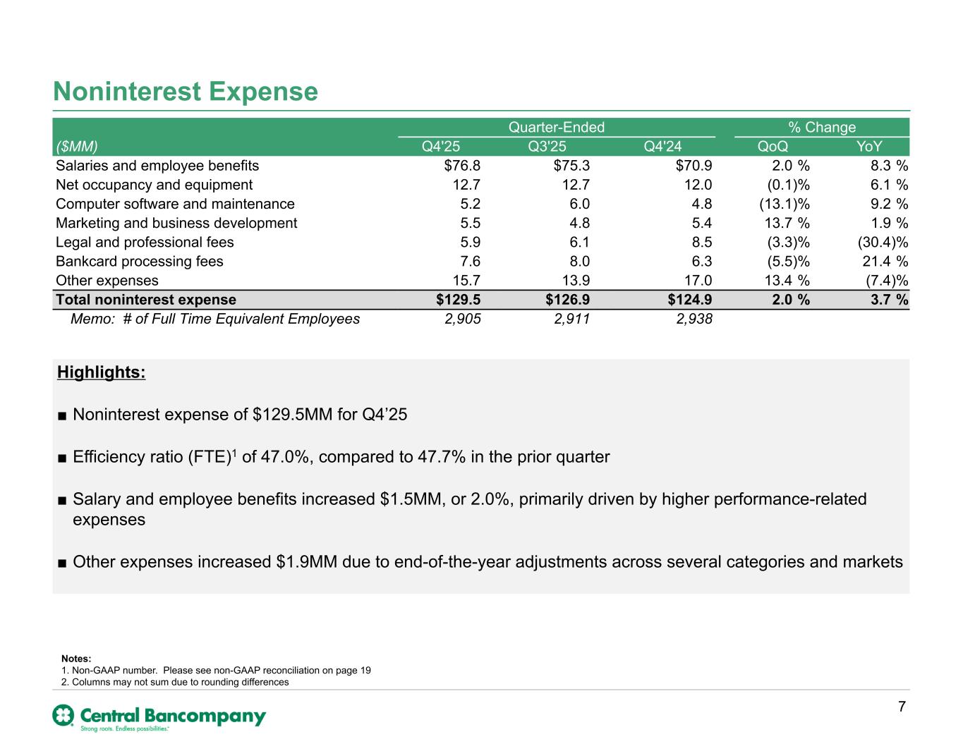 Central Bancompany, Inc. and Subsidiaries Quarterly Consolidated Statements of Income (unaudited) Q4 Q3 Q4 Q vs PQ Q vs PYQ FY25 FY25 FY24 $VAR %VAR $VAR %VAR (dollars in thousands, except per common share data) Interest income: Loans $ 178,961 $ 179,351 $ 179,835 $ (390) (0.2) % $ (874) (0.5) % Investment securities 64,582 62,343 45,132 2,239 3.6 % 19,450 43.1 % Short-term earning assets 11,741 7,081 7,730 4,660 65.8 % 4,011 51.9 % Total interest income 255,284 248,775 232,697 6,509 2.6 % 22,587 9.7 % Interest expense: Deposits 43,133 44,066 43,813 (933) (2.1) % (680) (1.6) % Federal funds purchased and customer repurchase agreements 5,688 5,837 6,474 (149) (2.6) % (786) (12.1) % Total interest expense 48,821 49,903 50,287 (1,082) (2.2) % (1,466) (2.9) % Net interest income 206,463 198,872 182,410 7,591 3.8 % 24,053 13.2 % Provision for credit losses 3,016 3,382 2,618 (366) (10.8) % 398 15.2 % Noninterest income: Service charges and commissions 14,553 14,955 14,296 (402) (2.7) % 257 1.8 % Payment services revenue 17,063 17,111 17,063 (48) (0.3) % - — % Brokerage services 7,701 7,266 6,629 435 6.0 % 1,072 16.2 % Fees for fiduciary services 14,214 12,973 12,300 1,241 9.6 % 1,914 15.6 % Mortgage banking revenues, net 9,408 10,297 10,366 (889) (8.6) % (958) (9.2) % Investment securities (losses), net - (6,920) (39,257) 6,920 (100.0) % 39,257 (100.0) % Other income 2,832 1,388 2,648 1,444 104.0 % 184 6.9 % Total noninterest income 65,771 57,070 24,045 8,701 15.2 % 41,726 173.5 % Less: Investment securities (losses), net - (6,920) (39,257) 6,920 (100.0) % 39,257 (100.0) % Total adjusted noninterest income 1 65,771 63,990 63,302 1,781 2.8 % 2,469 3.9 % Noninterest expenses: Salaries and employee benefits 76,799 75,298 70,938 1,501 2.0 % 5,861 8.3 % Net occupancy and equipment 12,731 12,748 11,999 (17) (0.1) % 732 6.1 % Computer software and maintenance 5,241 6,032 4,800 (791) (13.1) % 441 9.2 % Marketing and business development 5,476 4,818 5,372 658 13.7 % 104 1.9 % Legal and professional fees 5,923 6,125 8,505 (202) (3.3) % (2,582) (30.4) % Bankcard processing, rewards and related cost 7,595 8,040 6,254 (445) (5.5) % 1,341 21.4 % Other expenses 15,749 13,884 17,005 1,865 13.4 % (1,256) (7.4) % Total noninterest expenses 129,514 126,945 124,873 2,569 2.0 % 4,641 3.7 % Income before income taxes 139,704 125,615 78,964 14,089 11.2 % 60,740 76.9 % Income taxes 32,113 28,516 17,079 3,597 12.6 % 15,034 88.0 % Net income $ 107,591 $ 97,099 $ 61,885 $ 10,492 10.8 % $ 45,706 73.9 % Less: Investment securities (losses), net of taxes - (5,270) (29,898) 5,270 (100.0) % 29,898 (100.0) % Adjusted net income 1 $ 107,591 $ 102,369 $ 91,783 $ 5,222 5.1 % $ 15,808 17.2 % End of period shares 241,106 220,665 220,385 20,441 9.3 % 20,721 9.4 % Weighted average fully diluted shares 229,267 220,059 220,234 9,208 4.2 % 9,033 4.1 % Net income per common share - diluted $ 0.47 $ 0.44 $ 0.28 $ 0.03 6.3 % $ 0.19 67.0 % Adjusted net income 1 per common share - diluted $ 0.47 $ 0.47 $ 0.42 $ - 0.8 % $ 0.05 12.6 % Dividends / share $ 0.155 $ 0.055 $ 0.125 $ 0.100 181.8 % $ 0.030 24.0 % 1 This is a non-GAAP financial measure management believes is helpful to understanding trends in our business that may not be fully apparent based only on the most comparable GAAP financial measure. Further information on this financial measure and a reconciliation to the most comparable GAAP financial measure is provided at the end of this release. 6-